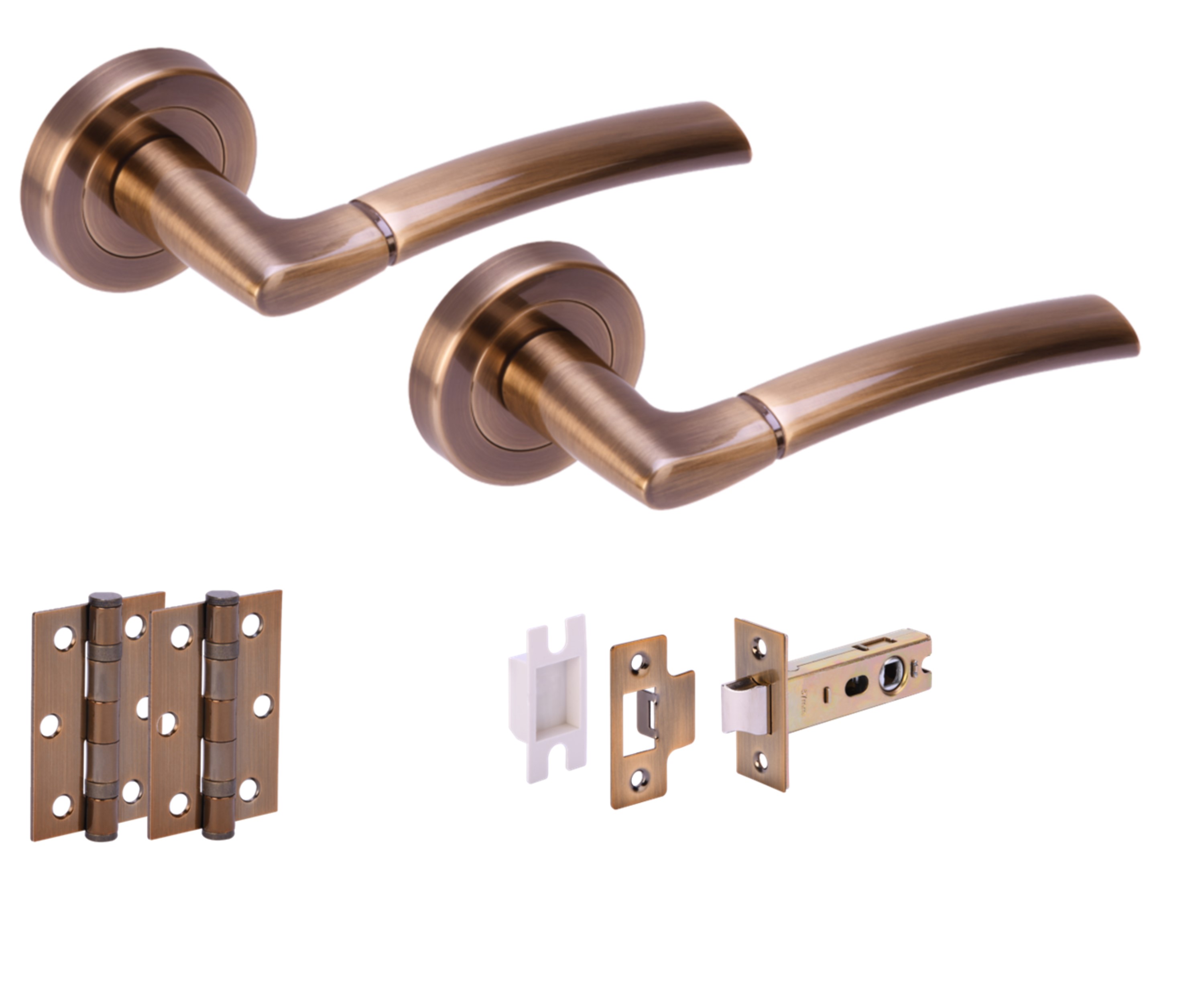 The HUNTA® NEMO Antique Bronze Passage Doorpack is a comprehensive kit designed for securing and adding an elegant touch to 35mm – 44mm thick doors. It features a pair of modern premium aluminium levers named Nemo that rest upon concealed screw zinc roses, offering a sleek and contemporary look. The levers are an aesthetically pleasing antique bronze color, with a lever length of 123mm and a projection of 62mm. The kit includes two matching ball bearing hinges and a heavy-duty rectangular passage latch with a box keep, ensuring smooth and reliable operation. The hinges and lever are supplied with bolt-through fixing bolts for a secure installation, and the latch features a grooved 100 x 8mm spindle to enforce strength and privacy. Wood screws are supplied for completeness, and the kit’s compatibility with matching bathroom turn/release sets and escutcheons allows users to maintain a consistent design throughout their space.