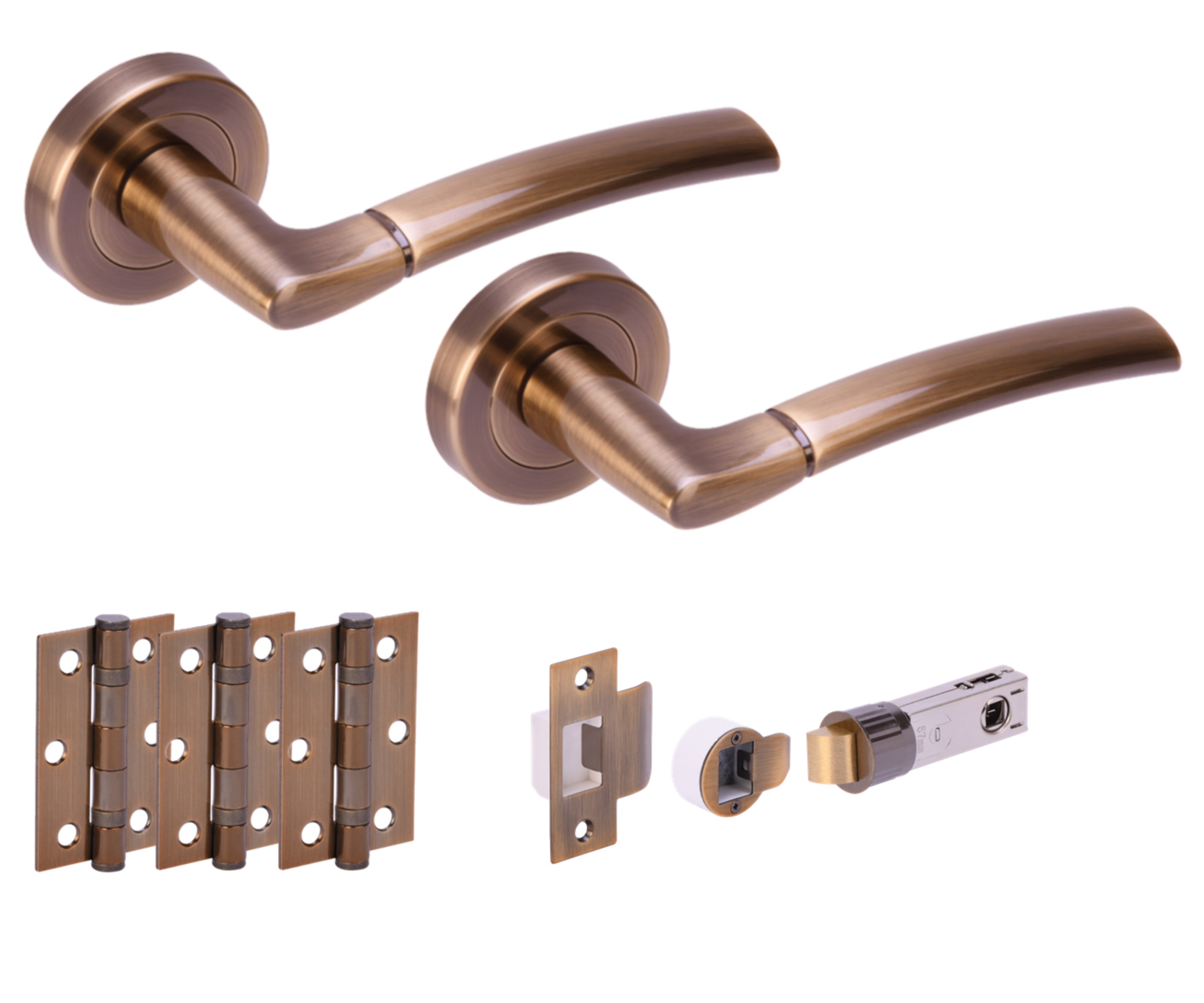 The HUNTA® NEMO Antique Bronze Passage Doorpack is a modern door hardware set designed to provide a complete solution for passage doors measuring 35mm – 44mm in thickness. The kit includes a pair of designer levers constructed from premium aluminum attached to a zinc concealed screw-on rose, lending a contemporary touch to door interiors. The passage lever set, striking in an antique bronze finish, is complemented by three bullet-style latch hinges that ensure smooth operation and secure door alignment. The kit further provides bolt-through fixing bolts, an 8mm grooved spindle, grub screws, and the necessary wood screws for a robust installation. This kit also allows for compatibility with suited bathroom turn/release sets and escutcheons for a cohesive look across different door types. With a comprehensive offering of high-quality components, this doorpack is designed for those seeking a harmony of style, reliability, and ease of installation.