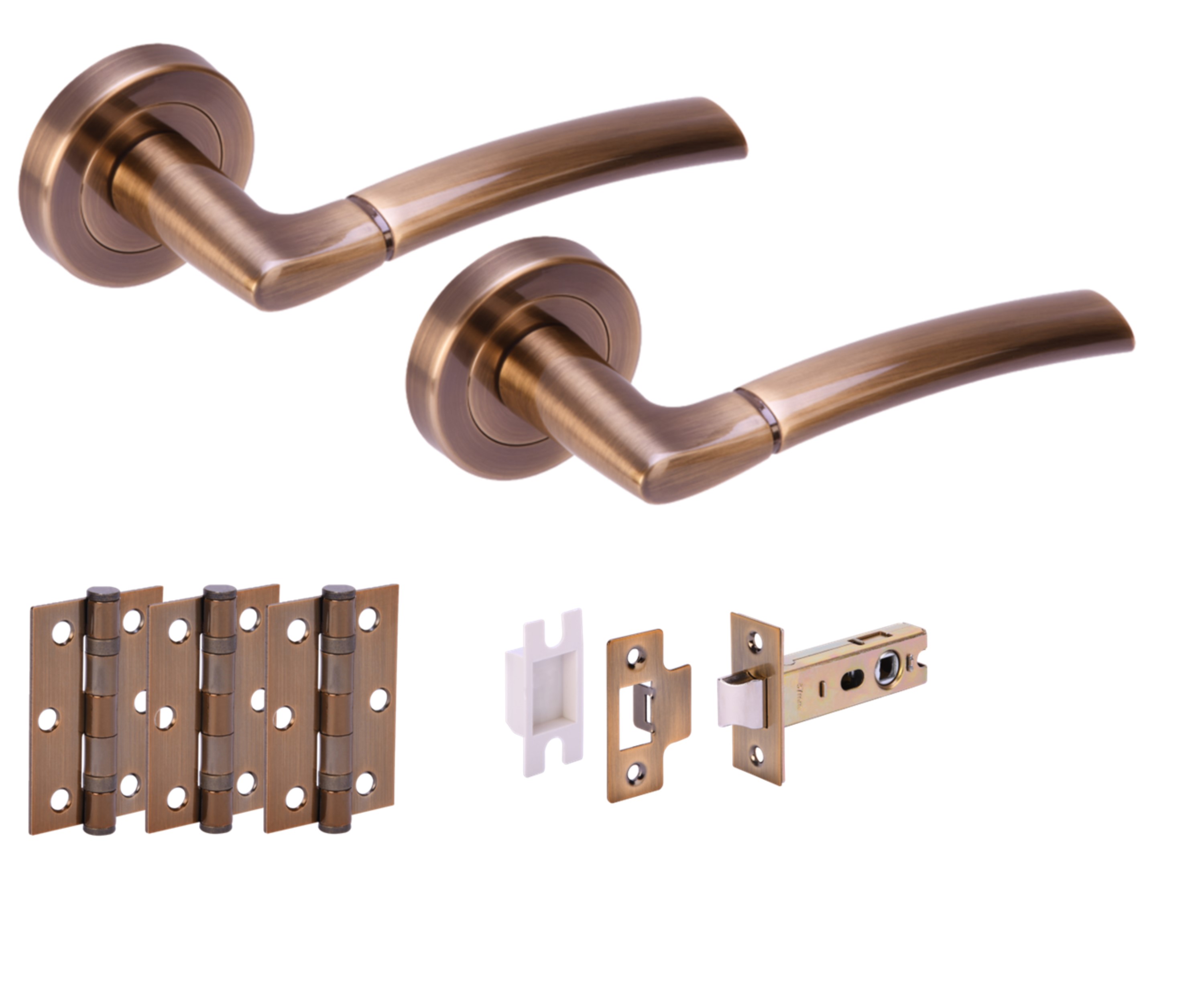 The HUNTA® NEMO Antique Bronze Passage Doorpack is designed for installation on doors ranging from 35mm to 44mm in thickness, offering a complete solution for passage doors that do not require locking. The kit includes a passage lever set showcasing a modern premium aluminium designer lever named Nemo attached to a zinc screw-on rose, three ball-bearing hinges to facilitate smooth door operation, and a heavy latch with a box keep for secure closure. The passage lever set comes with bolt-through fixing bolts for a stable installation and a grooved 8mm spindle with grub screws to ensure a robust handle connection. The sleek antique bronze finish adds a touch of elegance to door hardware, supplemented by the privacy door pack option for spaces requiring privacy. Suited bathroom turn/release sets and escutcheons are also available separately, making this doorpack versatile for various uses. The screw-on rose with a concealed fitting adds to the clean appearance of the installation. Wood screws for hinge attachment are also included in the kit.