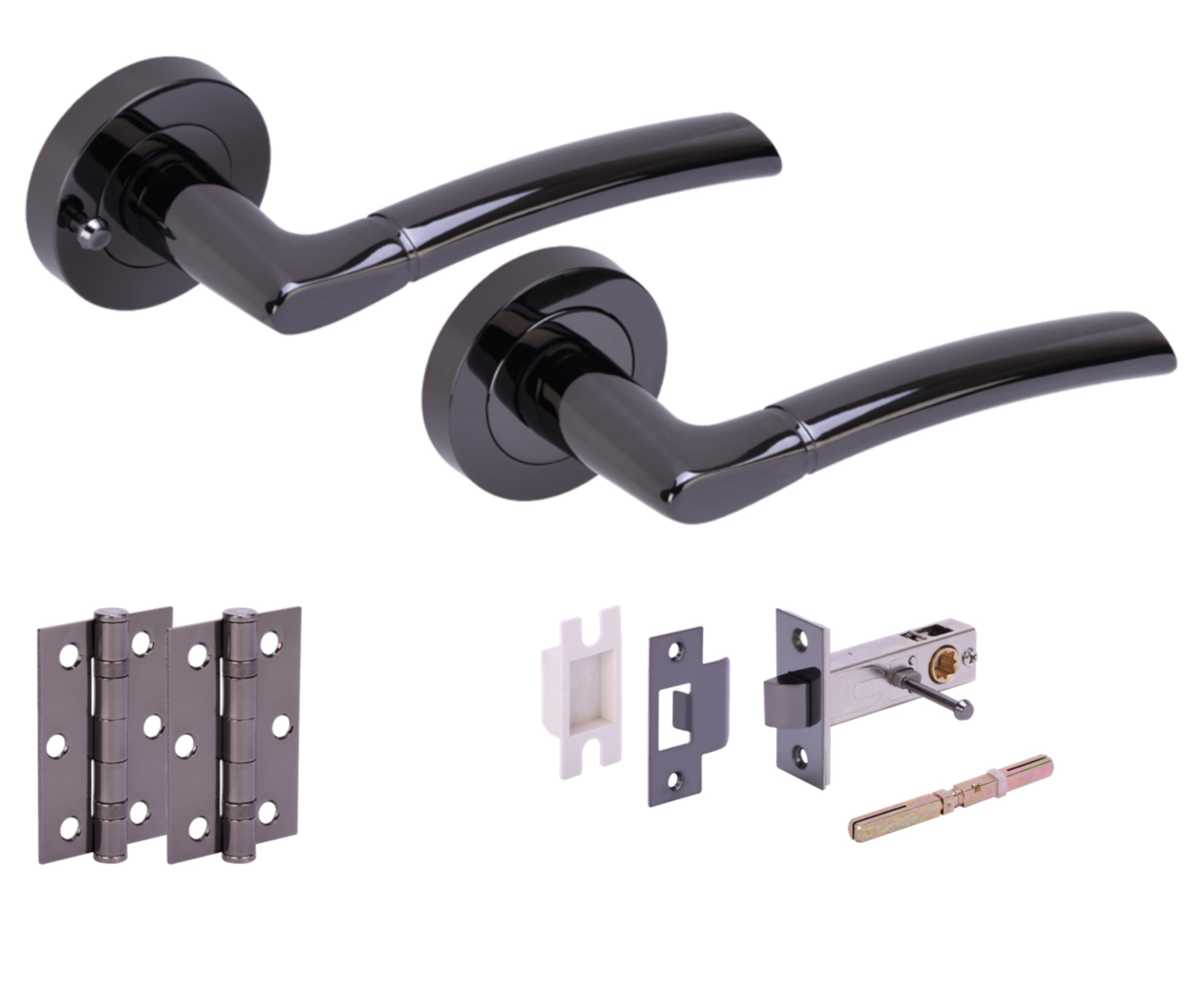 The HUNTA® NEMO Black Nickel Privacy Doorpack is designed to enhance privacy in indoor spaces with its comprehensive set of door hardware. The kit includes a modern premium privacy lever set made from premium aluminum with a zinc screw-on rose in a sleek black nickel (BNL) finish. It is supplied with bolt-through fixing bolts for secure installation and a 100 x 8mm grooved spindle with grub screws to ensure a stable connection. The kit is also equipped with two ball bearing (B/B) hinges and a heavy-duty rectangular latch with a box keep, making it suitable for doors with a thickness ranging from 35mm to 44mm. Offering both function and style, the Nemo lever has a length of 123mm and a projection of 62mm, providing a comfortable grip. The rose/backplates are sizable with a diameter of 53mm and thickness of 10mm, designed for concealed screw mounting. Wood screws are included to facilitate easy installation. This door pack is designed for privacy function and features a privacy split spindle complementing the latch.