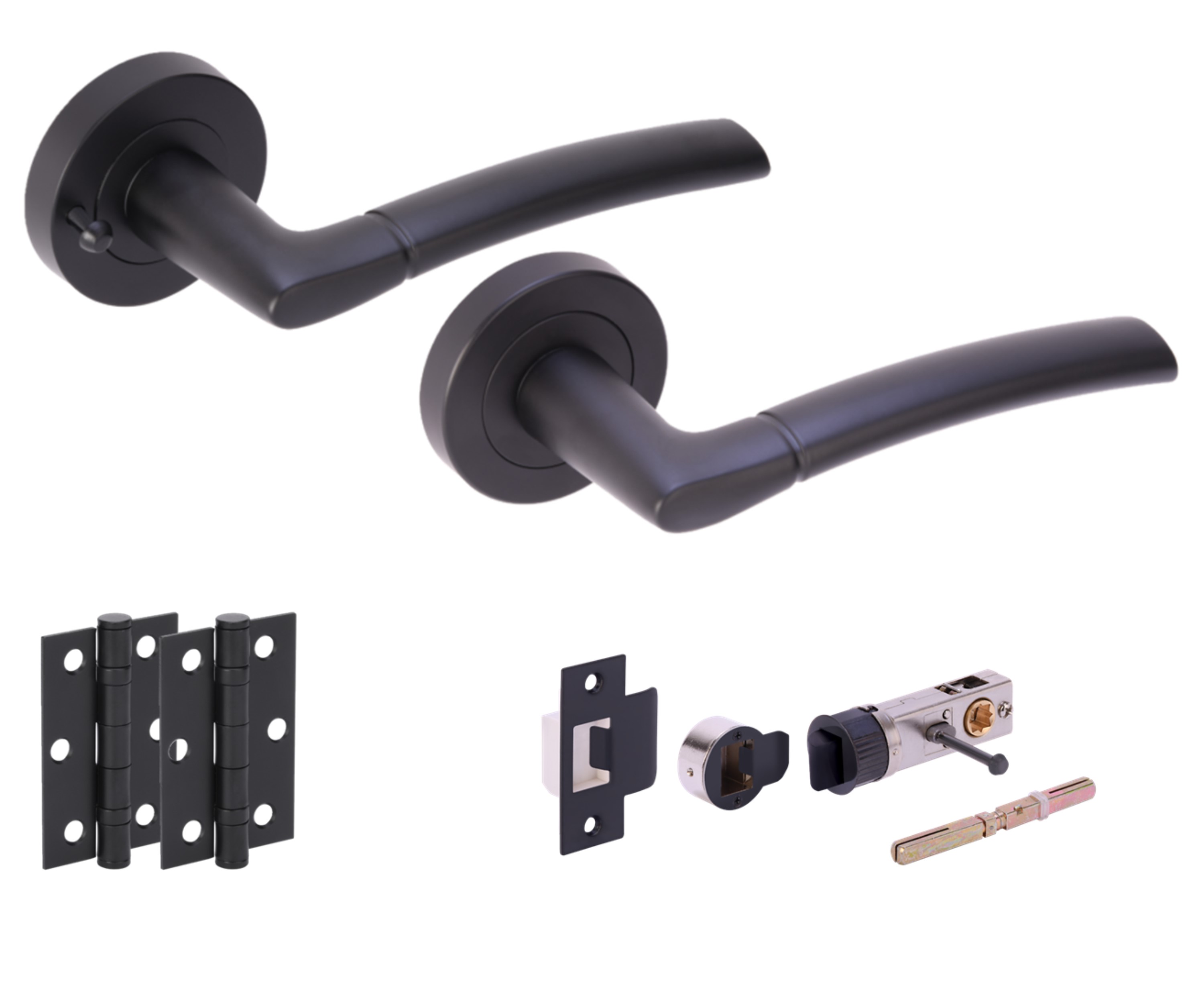 The HUNTA® NEMO Matt Black Privacy Doorpack provides a complete solution for privacy door hardware needs. Designed for modern aesthetics, this kit includes two bullet-style latches and a set of premium privacy levers crafted from aluminium with a zinc screw-on rose. The matt black finish offers a contemporary look that easily integrates into various door styles. Suitable for doors ranging from 35mm to 44mm in thickness, the privacy lever set is easy to install, with bolt-through fixing bolts and wood screws included for secure installation. The kit further comes with a compass privacy function rose fixing, enhanced by its concealed screw design for a clean presentation. Passage door pack versions are also available, and the hinges add to the sleek look while ensuring reliable performance.