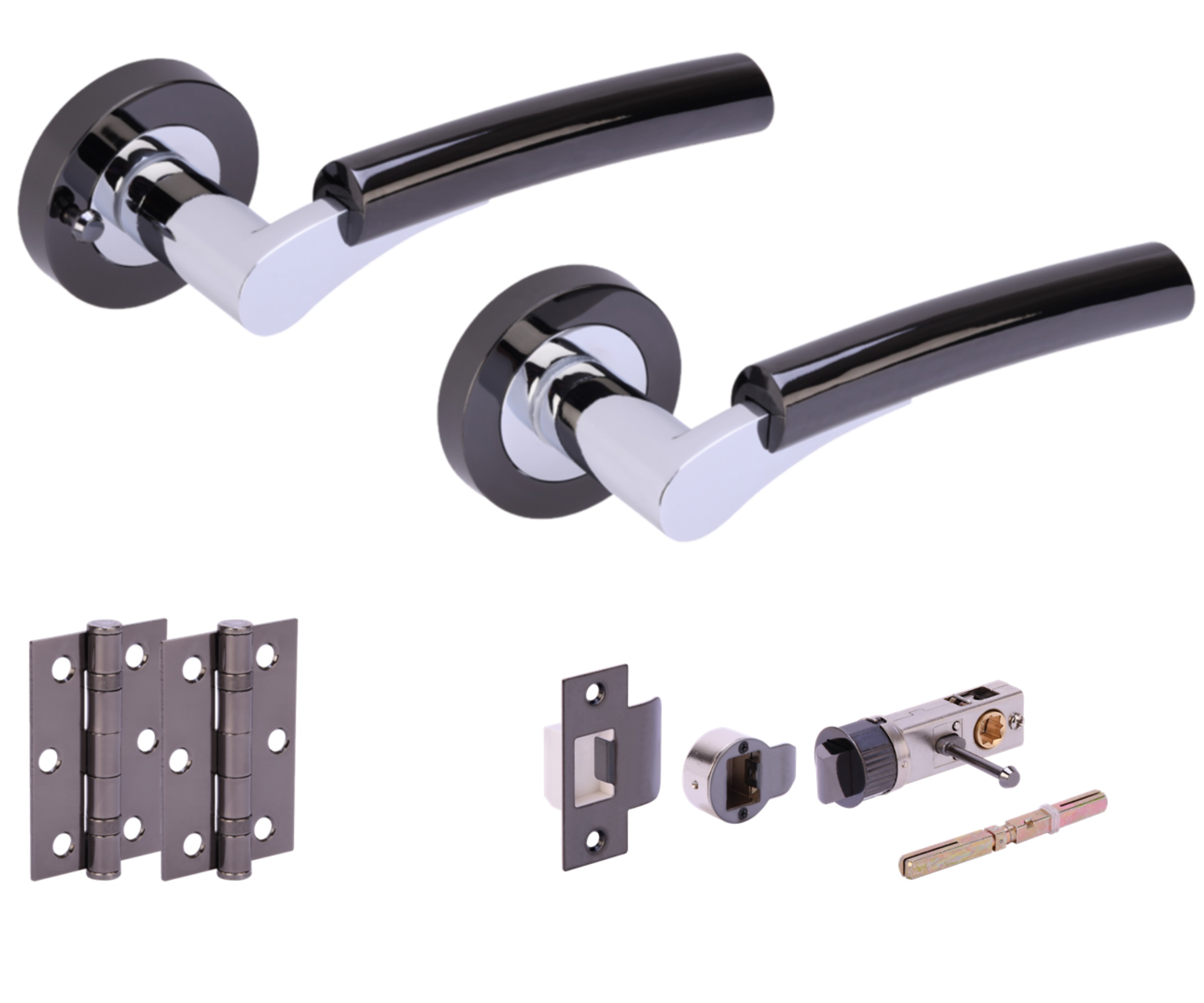 The HUNTA® RAIDA Black Nickel/Polished Chrome plated Privacy Doorpack is designed to add modern style and privacy functionality to interior doors ranging from 35mm to 44mm thickness. The kit includes a set of two hinges, a dual-finish privacy lever set featuring a contemporary aluminum designer lever on a zinc screw-on rose, and a bullet-style latch for privacy. The lever set is finished in black nickel and polished chrome, offering a sleek appearance. The kit is supplied with bolt-through fixing bolts for a secure installation, a 100x8mm grooved spindle, and grub screws. The set is meant for privacy applications such as on bathroom or bedroom doors, accommodating user comfort and design aesthetics in residential or commercial interiors.