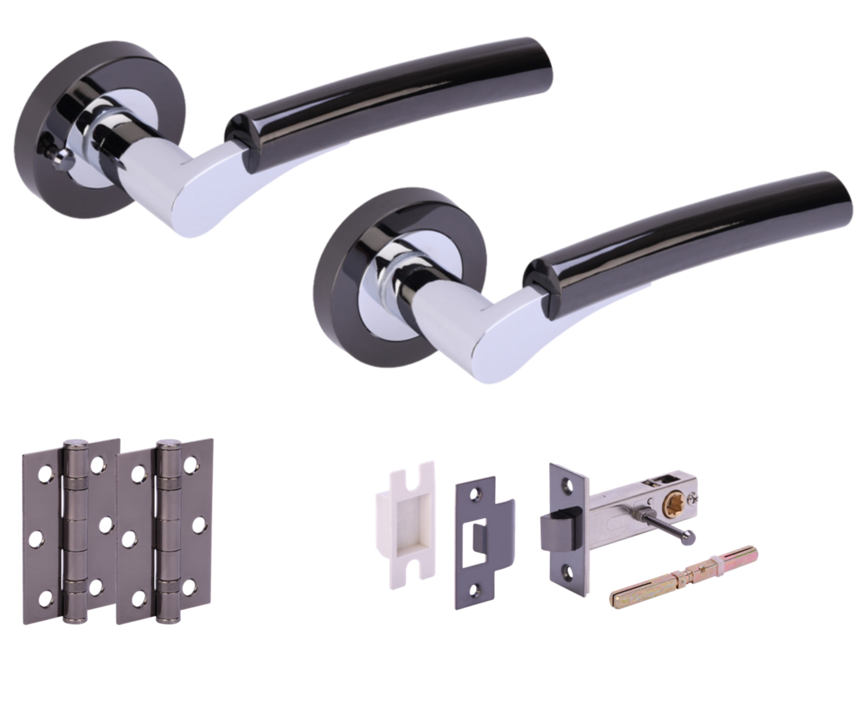 The HUNTA® RAIDA Black Nickel/Polished Chrome plated Privacy Doorpack is designed to provide all the necessary hardware for a single privacy door installation. The kit includes a modern dual-finish designer lever set, named Raida, which features premium aluminium levers on a zinc screw-on rose with a concealed fixing for a sleek appearance. The black nickel and polished chrome finishes offer a striking contrast that enhances the visual appeal. The lever set is designed for use on doors with a thickness of 35mm to 44mm and is supplied with bolt-through fixing bolts for secure mounting. Also included are two (x2) ball bearing hinges and a heavy latch complete with a box keep, creating a cohesive and functional door hardware package. The lever has a length of 132 millimeters and a projection of 51 millimeters, making it ergonomically comfortable for use. The rose or backplate has a diameter and width of 53 millimeters with a thickness of 10 millimeters. The privacy function is suitable for bathrooms or bedrooms where privacy is required. The doorpack is equipped with an 8x8x100 millimeter grooved spindle and grub screws, as well as wood screws for installation. A passage door pack version is also mentioned as available, which is typically used for doors where privacy is not a concern.