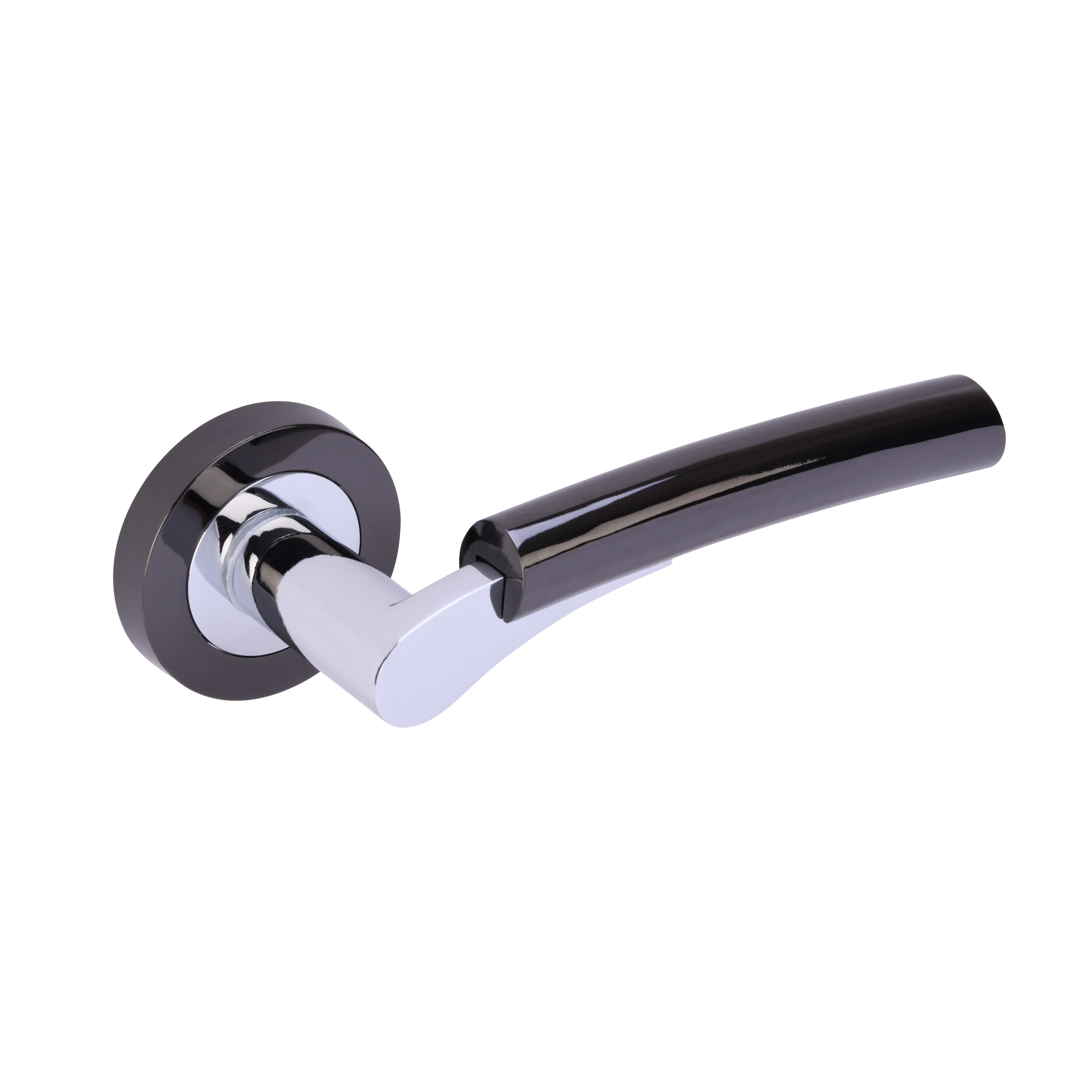 The HUNTA® Raida Lever on rose is a passage door handle featuring a Black Nickel-Polished Chrome plated finish. It is categorized under Levers on Rose – Aluminium Premium. This stylish and modern door handle boasts a contemporary dual finish, an 8-point fixing Compass base rose for enhanced stability, and is supplied with bolt-through fixings and wood screws for a secure installation. The lever design is complemented by the Press for Privacy function which is available as an optional feature, accentuating its versatility and user-friendly nature. Built from durable aluminium and zinc materials, it’s designed to fit seamlessly into modern interior spaces with its sleek aesthetic and matching accessories.