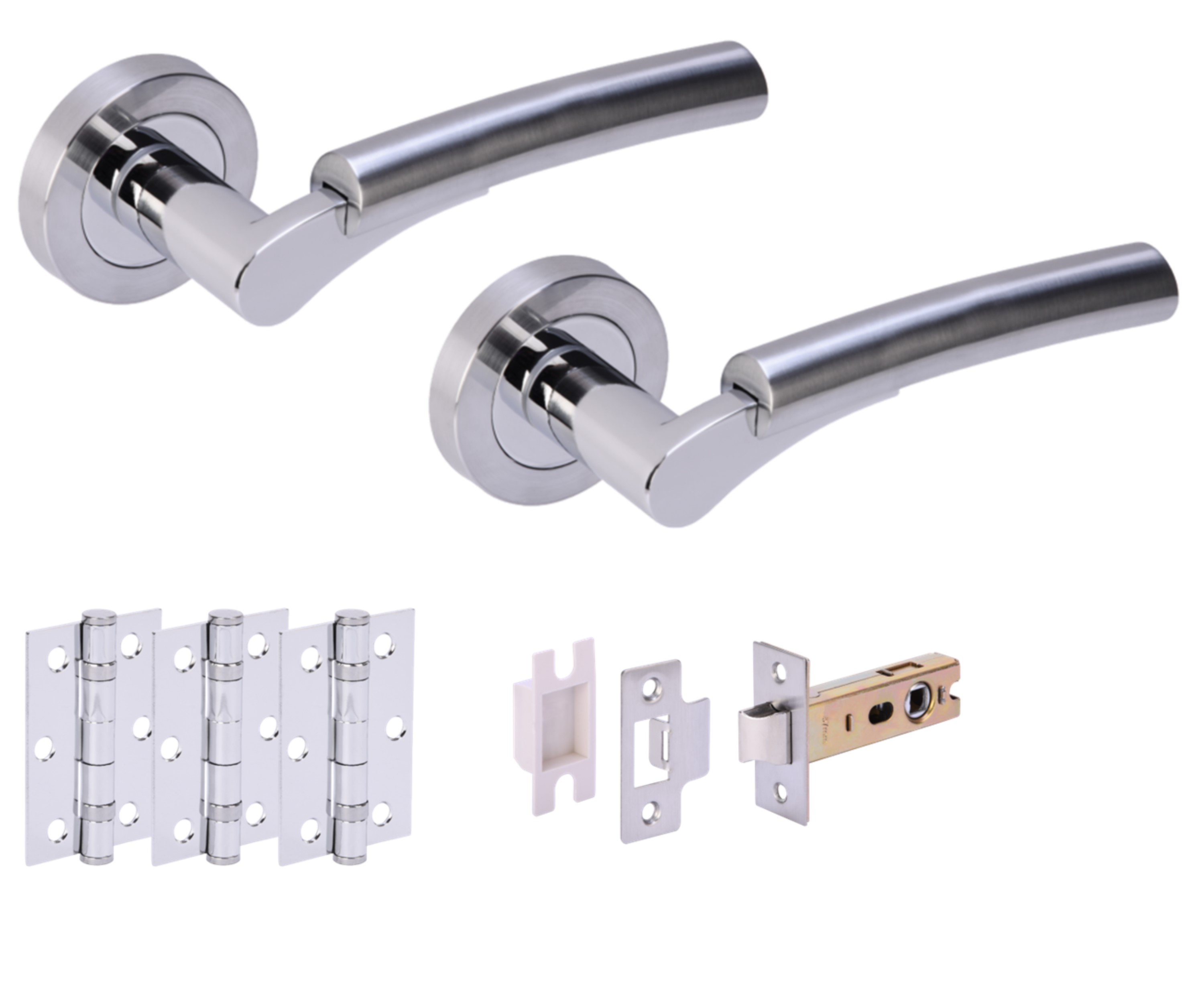 The HUNTA® RAIDA Polished Chrome plated/Satin Chrome plated Passage Doorpack is designed for interior doors, providing a modern dual finish with a designer aesthetic and reliable function. This premium passage door kit is meant for doors 35mm – 44mm in thickness and includes a set of two stylish lever handles on a concealed screw rose, three ball-bearing hinges for smooth operation, and a heavy-duty latch complete with a box keep for a secure and neat installation. The levers are made of aluminium with a combination Polished Chrome and Satin Chrome finish, creating an attractive appearance. Also included are bolt-through fixing bolts, a 100mm grooved spindle with grub screws, and wood screws for installation. This door pack is a passage set, perfect for doors that don’t need locking, such as closets or rooms where privacy is not a concern. A privacy door pack version and suited bathroom turn/release sets, as well as escutcheons for locking doors, are also available in the same style to maintain design consistency throughout a property.
