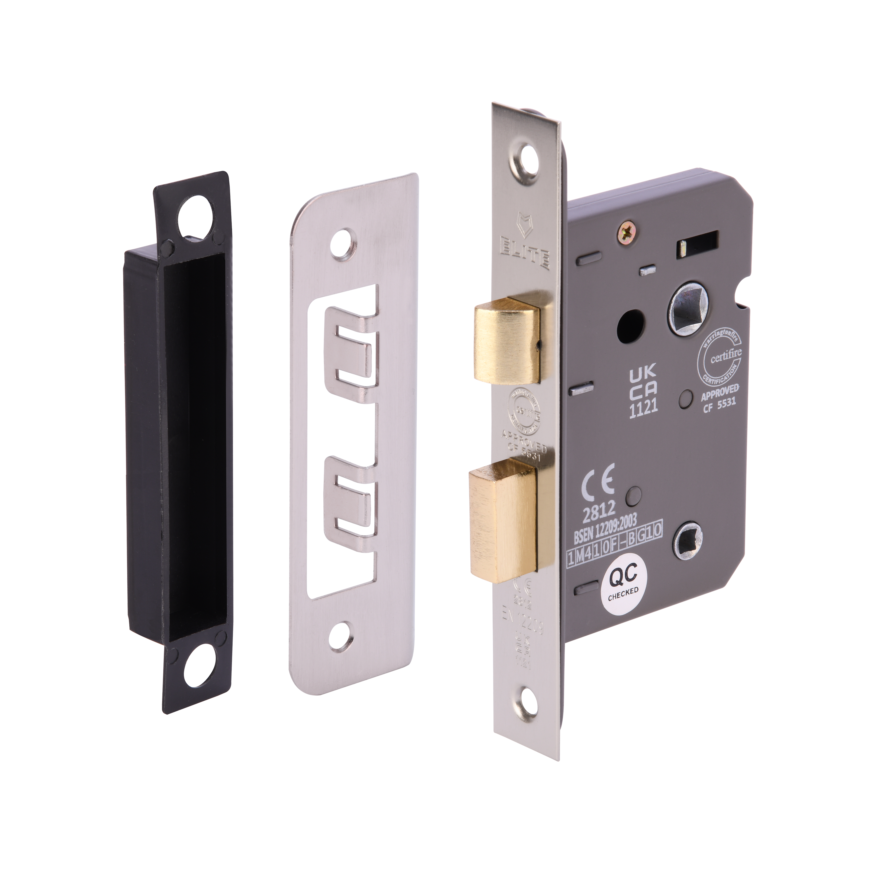The HUNTA® Satin Nickel plated 63mm Bathroom Lock kit is designed for use in bathroom door locking scenarios, ensuring privacy and security. The kit includes a main lock case with an angled bolt through latch and a dead bolt, a fully lipped box keep, and a double – loose forend, all finished in an elegant satin nickel plating for a modern aesthetic. The box keep is made of plastic, promoting ease of installation and durability. This kit is certified and suitable for fire doors (FD30-60), having been rigorously tested for cycle and durability (EN12209:2003) as well as fire resistance (EN-1634-1). The kit also allows for bolt-through fixings and comes with reversible latch functionality, making it adaptable for left or right-handed doors. Intumescent kits are available separately to ensure full compliance with fire safety certification. The kit is suitable for use with unsprung furniture and boasts a robust construction made of steel and zinc components.