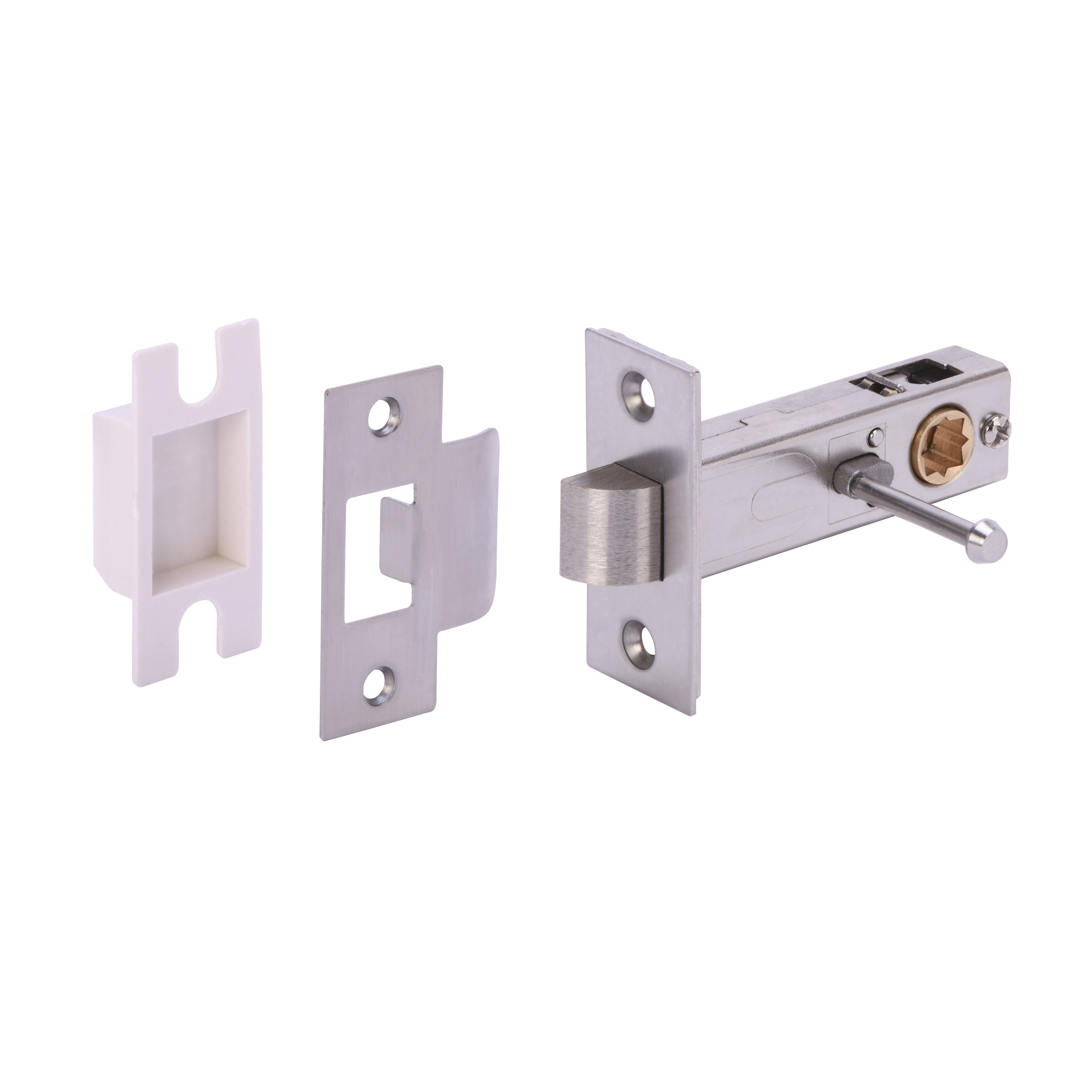 The HUNTA® Satin Nickel Plated 76mm Privacy Latch kit is designed for internal privacy doors, providing a convenient push-button locking mechanism from the inside, with emergency access from the outside. The rectangular latch kit, suitable for 57mm backset applications, ensures easy fitting as an alternative to traditional bath lock/bolt and thumbturn setups. Finished in elegant satin nickel, it includes all necessary fitting instructions for a quick installation. The kit features a UK tubular steel case, a brass follower, a zinc latch bolt, a flat plate keep, and a plastic box keep for the door frame. This complete setup allows for a reversible latch, adaptable to door orientation by pulling and twisting. Additionally, the double loose forends give the latch a versatile and secure fit.