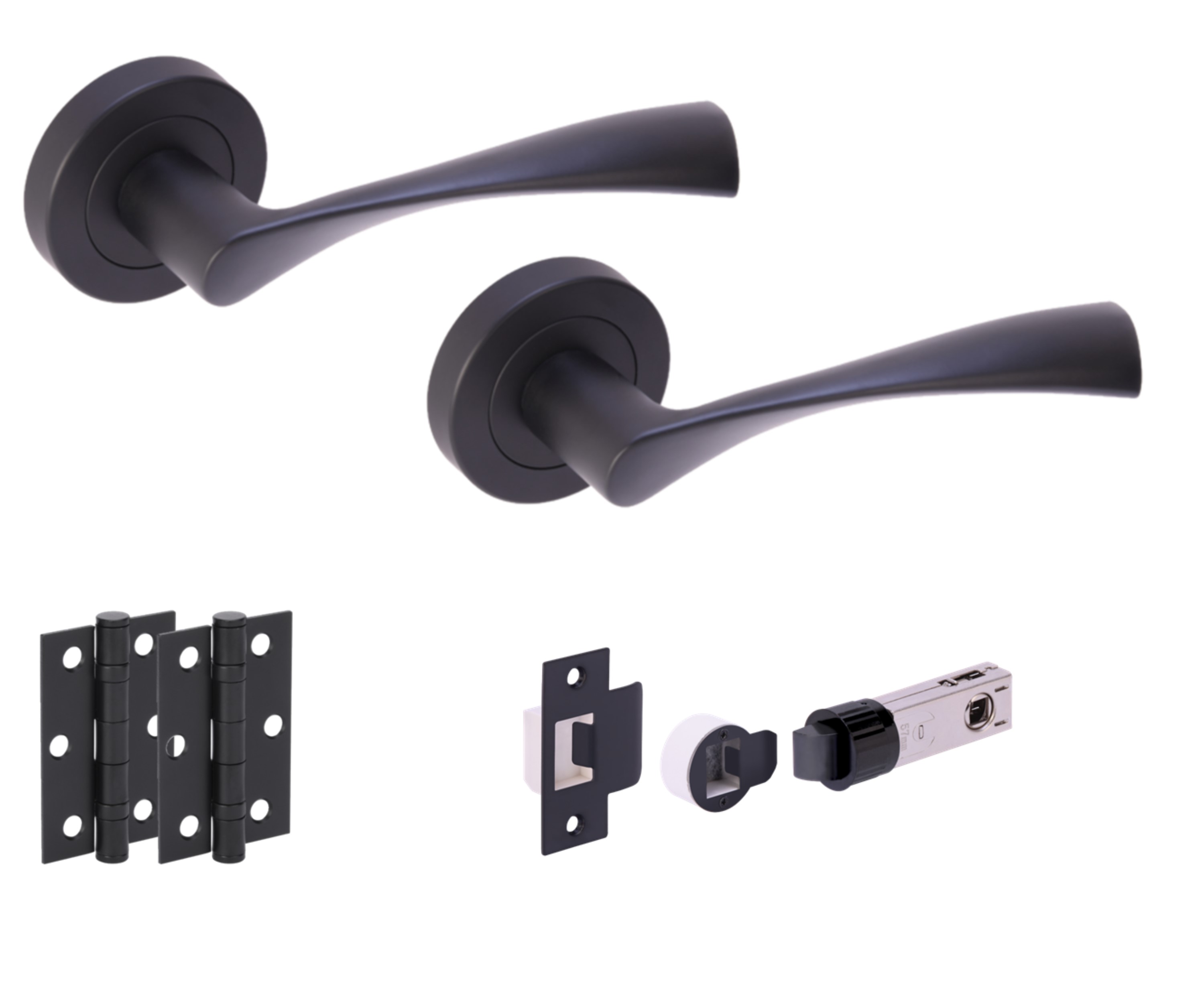 The HUNTA® ZENA Matt Black Passage Doorpack is a contemporary door hardware kit that includes a set of stylish passage levers, hinges, and a bullet latch, all designed in a cohesive matt black finish. The kit features a pair of premium aluminum levers with modern designer appeal mounted on zinc screw-on roses with concealed fixings for a sleek look. The levers are complemented by two matching butt hinges and a bullet latch mechanism, which together provide a complete solution for installing a passage door that does not require locking functionality. The kit is suitable for doors with a thickness ranging between 35mm and 44mm. Additionally, the package includes bolt-through fixing bolts for secure installation, a grooved spindle with grub screws to ensure a stable handle operation, and wood screws. Options for privacy door pack versions, bathroom turn/release sets, and escutcheons are also available within the range to accommodate different types of doors within residential or commercial settings.