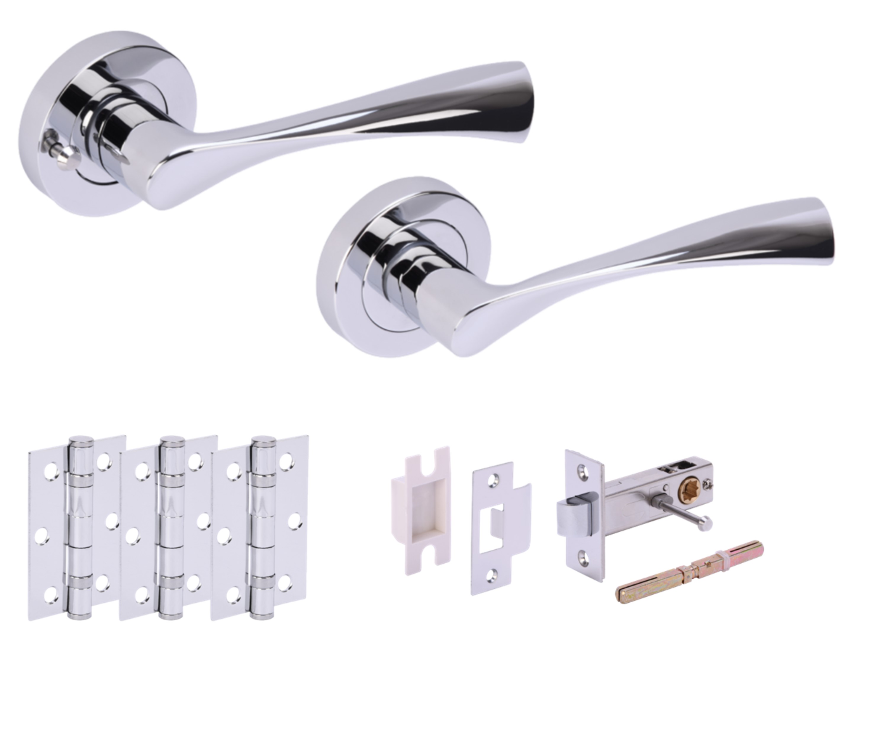 The HUNTA® ZENA Polished Chrome plated Privacy Doorpack is a comprehensive kit designed for privacy applications, perfect for use on interior doors ranging from 35mm to 44mm thickness. This kit includes a modern, premium designed Zena lever made from aluminium, finished in Polished Chrome (PCP), and seated on a zinc screw-on rose with concealed fixings for a sleek appearance. The lever has a length of 120mm with a projection of 71mm, ensuring comfortable grip and operation. The rose/backplate has a diameter and width of 53mm, with a 10mm thickness, providing a stable base for the lever. The doorpack comes with three stainless steel ball-bearing hinges, all necessary fixing bolts for secure attachment, a 100mm x 8mm grooved spindle with grub screws to ensure the lever’s functionality, and a heavy-duty privacy latch with a box keep. This kit is suitable for creating a unified, stylish look within a room while maintaining privacy. A passage door pack version of this lever set is also available for non-privacy doors.