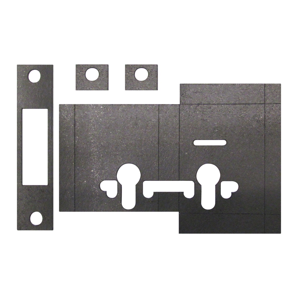 The I-CE Locking Systems Intumescent Self Adhesive Kit is designed for enhancing the fire resistance of 5-lever deadlocks and Euro profile locks, suitable for a 63/75mm lock case size and rated for FD60 fire doors. This comprehensive fire-protection solution includes an intumescent lock wrap with a clear, self-adhesive backing for easy installation, two intumescent hinge pads, and rectangular intumescent patches to be placed over the keyhole and cylinder areas, all with a self-colour finish, providing a consistent and sleek appearance without additional coatings. The intumescent material is crucial in expanding under heat to seal gaps, thereby preventing the spread of fire and smoke, making this kit an essential component for achieving higher safety standards in commercial and residential buildings.