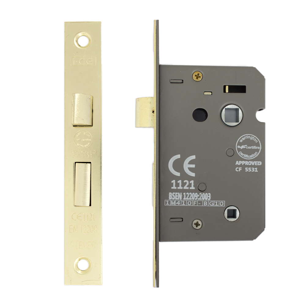 The I-CE Locking Systems # SB Bathroom Lock is a security essential designed for bathroom doors with a length of 63mm. It features a robust locking mechanism with a CE Mark and is approved by Certifire. Notable is the forend plate with detailed engravings, which includes compliance markings such as “CE1121,” “BS EN 12209:2009,” and a certification reference number “CF 5531.” Its construction aims to provide both functionality and compliance for safety and building regulations.