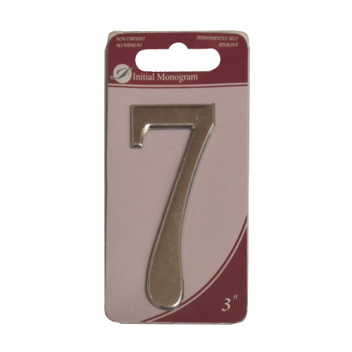 The Initial Monogram 3 inch Silver Effect Numeral 7 is a durable, non-tarnishing aluminum house number featuring a stylish silver finish. This self-adhesive numeral is perfect for house identification, being permanently adhesive and weather-resistant. Ideal for application on house plaques, bins, or any surface requiring clear numerical identification.