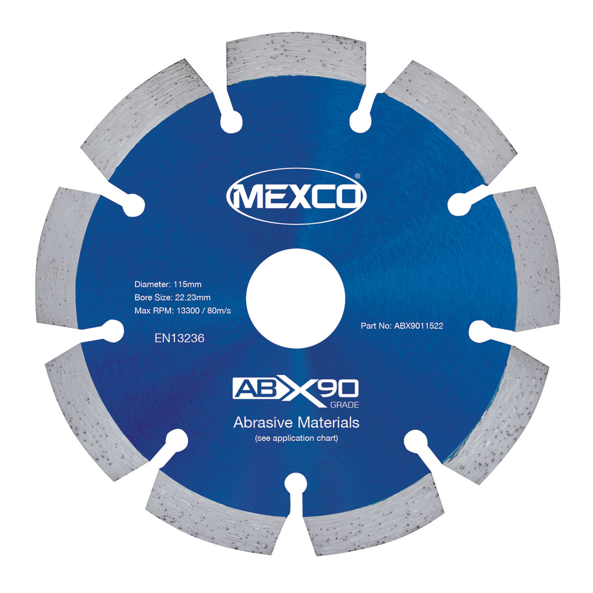 The MEXCO 115mm Abrasive Materials X90 Grade diamond cutting disc is specifically designed for cutting abrasive materials with precision and durability. Featuring a segmented rim design with diamond cutting segments, this blue-painted steel disc delivers reliable performance at speeds up to 13300 RPM. The disc meets EN13236 standards and is ideal for professional applications requiring clean, efficient cuts through challenging abrasive materials.