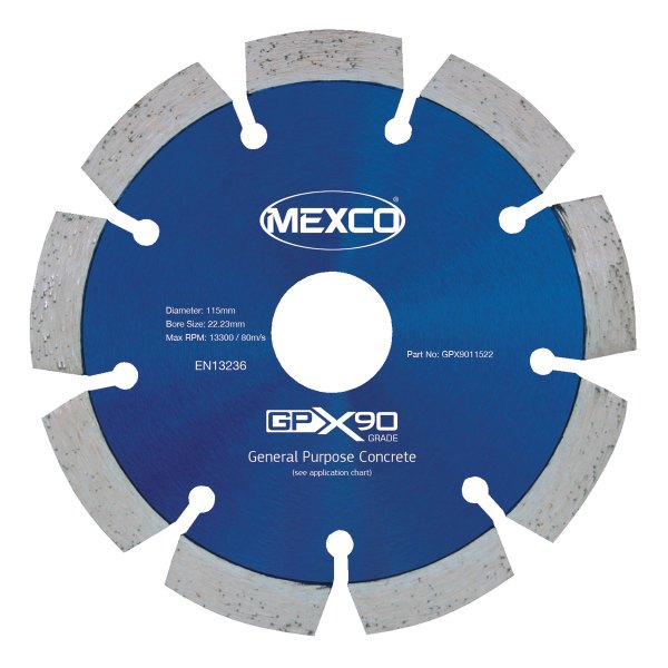 The MEXCO GPX90 115mm concrete cutting disc is a general purpose diamond blade designed for cutting concrete and masonry materials. This professional grade disc features a segmented rim design for efficient cutting and debris removal, with a maximum RPM rating of 13300/80m/s for reliable performance. The disc is EN13236 certified ensuring compliance with European safety standards for abrasive products.