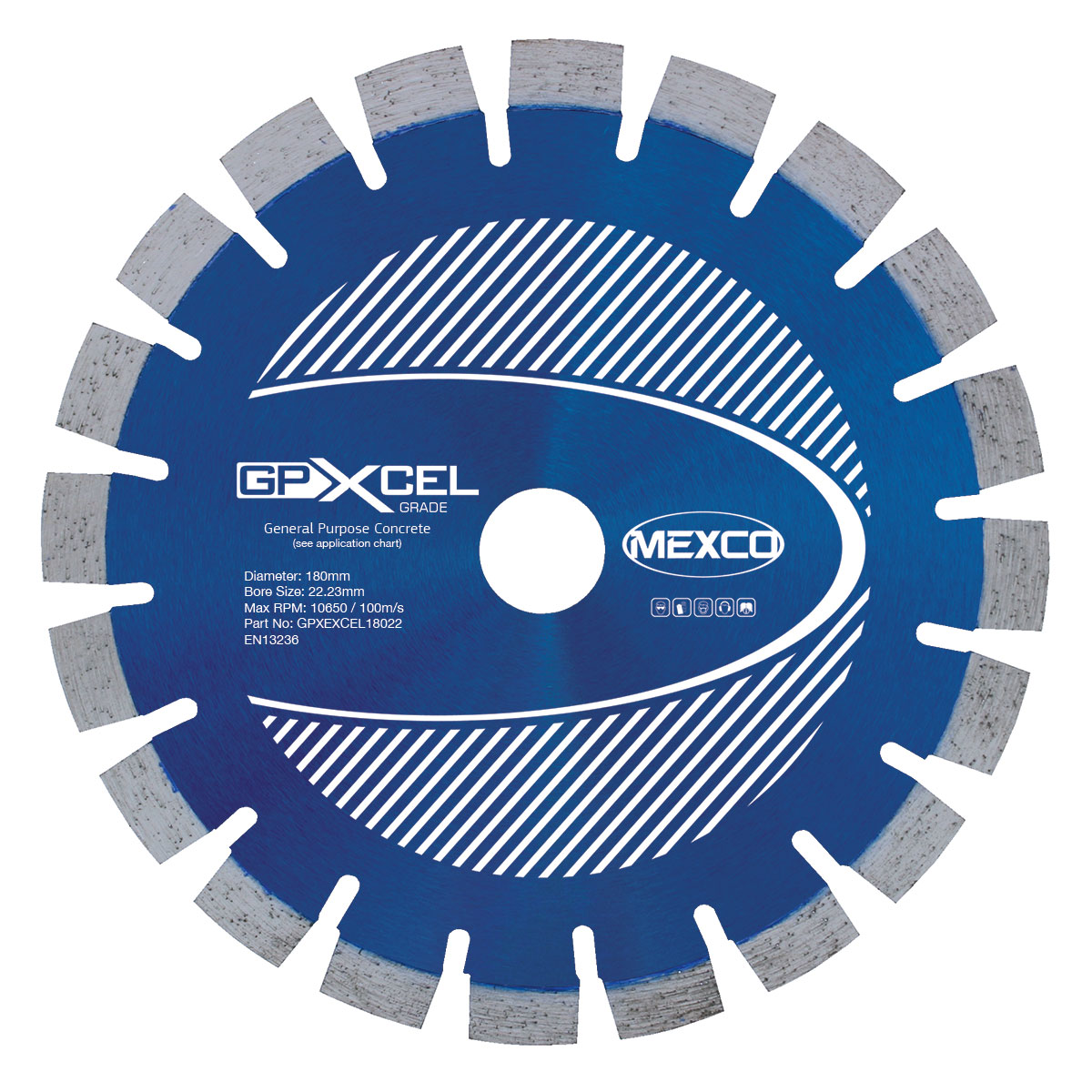 The 180MM CONCRETE XCEL GRADE is a general purpose diamond cutting disc designed for concrete applications. This MEXCO GPX XCEL GRADE disc features a 180mm diameter with a 22.23mm bore size and operates at a maximum speed of 10650/100m/s. The disc is EN13236 certified, ensuring reliable performance and safety standards for professional concrete cutting tasks.