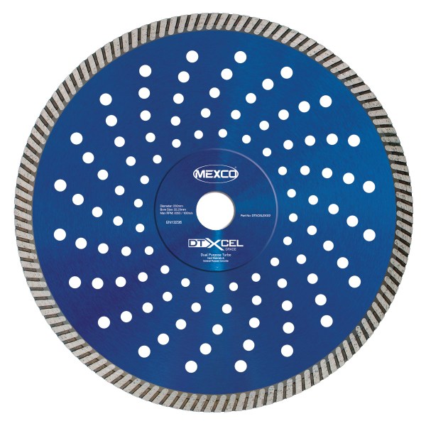 The MEXCO 230MM DUAL PURPOSE TURBO XCEL GRADE is a professional diamond cutting disc designed for versatile cutting applications. Featuring a distinctive blue painted steel body with strategically placed cooling holes and a turbo rim design, this disc delivers exceptional performance across multiple materials. The Xcel grade construction ensures durability and long-lasting cutting efficiency, making it ideal for both wet and dry cutting operations. Compliant with EN13236 standards, this disc provides reliable professional results for demanding construction and renovation projects.