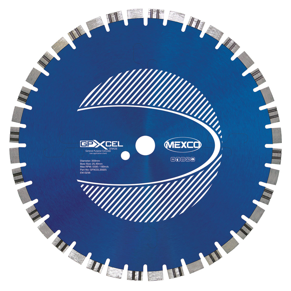 The 350MM CONCRETE XCEL GRADE is a professional diamond cutting blade designed for cutting concrete and similar materials. Featuring a segmented rim design for efficient cutting and debris removal, this 350mm diameter blade offers excellent performance for general purpose concrete applications. The blade is EN13236 certified ensuring compliance with European safety standards for diamond tools.