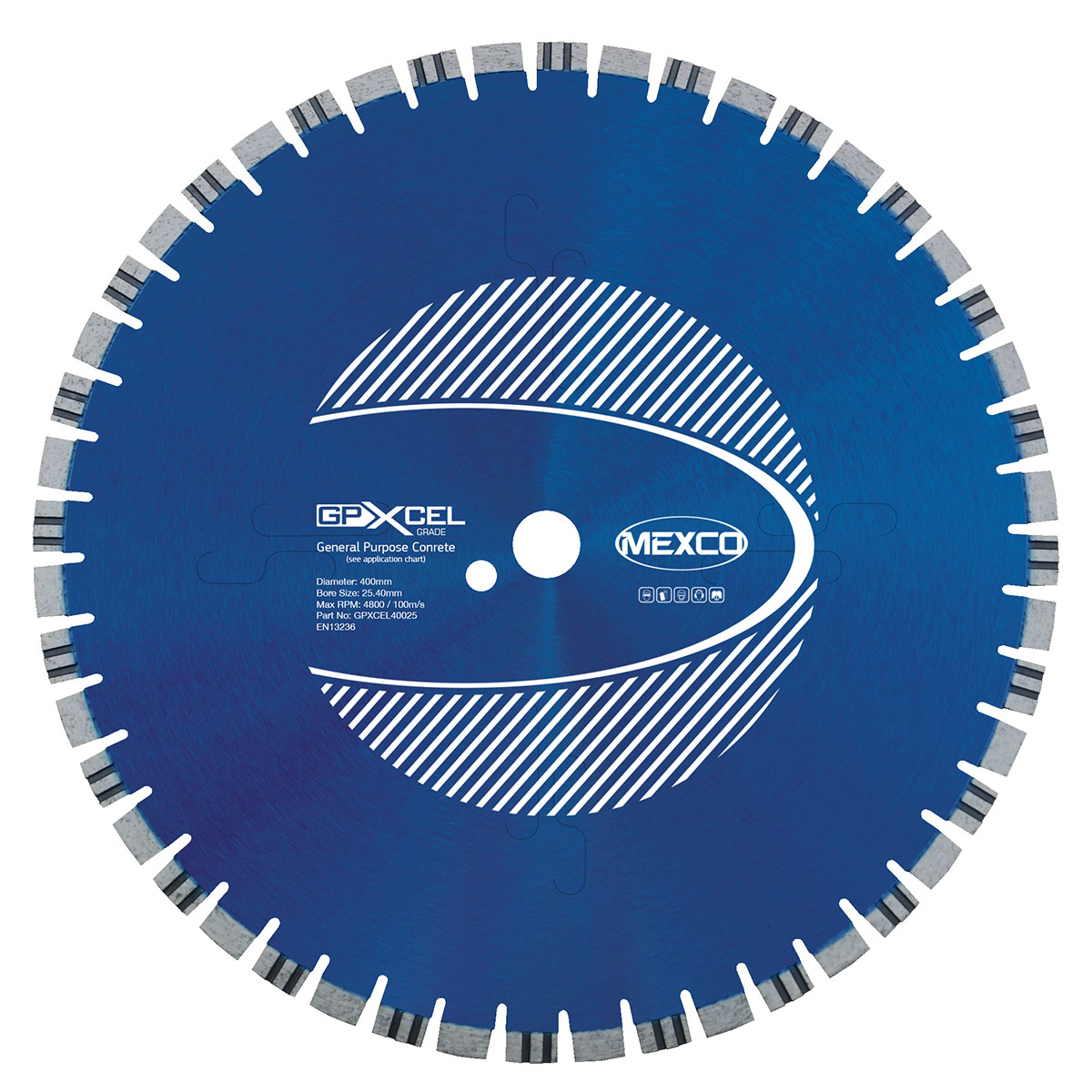 The 400MM CONCRETE XCEL GRADE is a professional diamond cutting blade designed for cutting concrete and masonry materials. This MEXCO GPXCEL blade features a 400mm diameter with segmented diamond cutting edge for efficient cutting performance. The blade has a 25.4mm bore size making it compatible with standard concrete cutting equipment and is EN13236 certified for professional use.