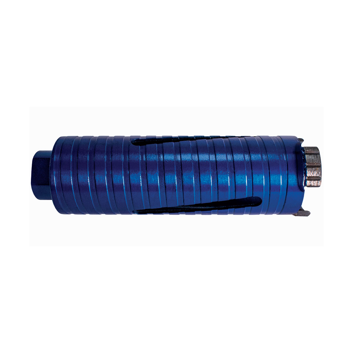 The 52MM DRY CORE DRILL SLOTTED XCEL GRADE is a professional diamond-tipped dry core drill designed for precise drilling in masonry, concrete, and similar materials. Featuring a distinctive blue painted steel construction with slotted design for enhanced debris clearance, this 52mm diameter drill delivers reliable performance for demanding drilling applications. The Xcel grade specification ensures durability and cutting efficiency for professional use.