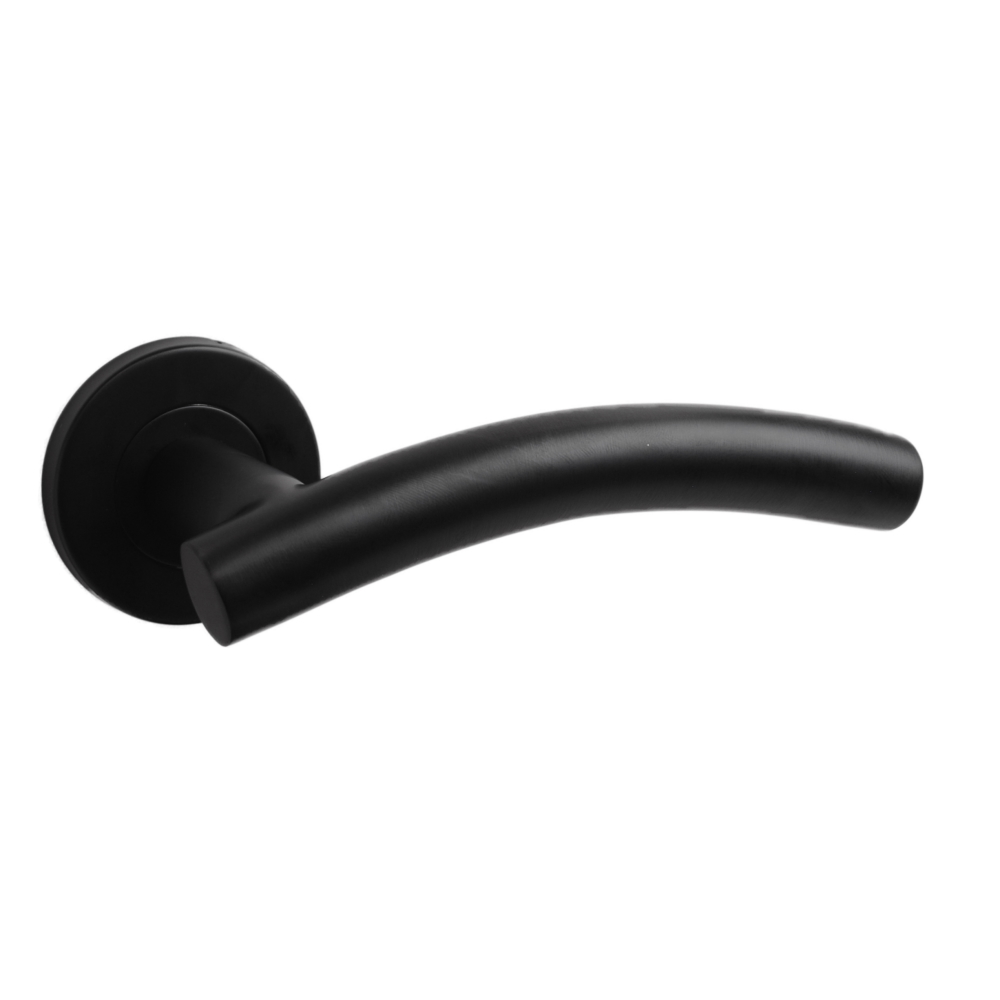 The ONYX Kurva Lever on Rose Matt Black is an elegantly designed door handle characterized by its modern, ergonomic curve. This lever on rose design implies a minimalistic aesthetic with a concealed attachment creating a clean appearance on doors. The matt black finish gives it a contemporary and sophisticated appeal, suitable for a variety of interior styles.