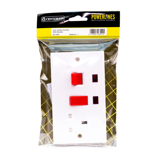 The Powerlines 45 Amp Cooker Switch with Socket provides convenient control of your electric cooker with an integrated 13A socket outlet. Features a neon indicator light for clear visual confirmation when the switch is powered on. This cooker control unit serves as both a power switch and isolator for safe and reliable cooker installation.