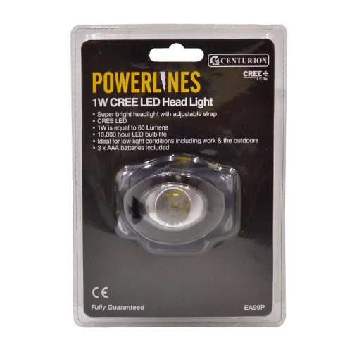 The POWERLINES 1W CREE LED Head Light is a versatile illumination solution featuring a powerful 1W CREE LED that delivers 60 lumens of brightness. Perfect for both work environments and outdoor activities in low light conditions, this head torch comes with an adjustable head strap for comfortable wear. The energy-efficient LED offers an impressive 10,000-hour bulb life and operates on 3 AAA batteries, providing reliable, hands-free lighting when you need it most.