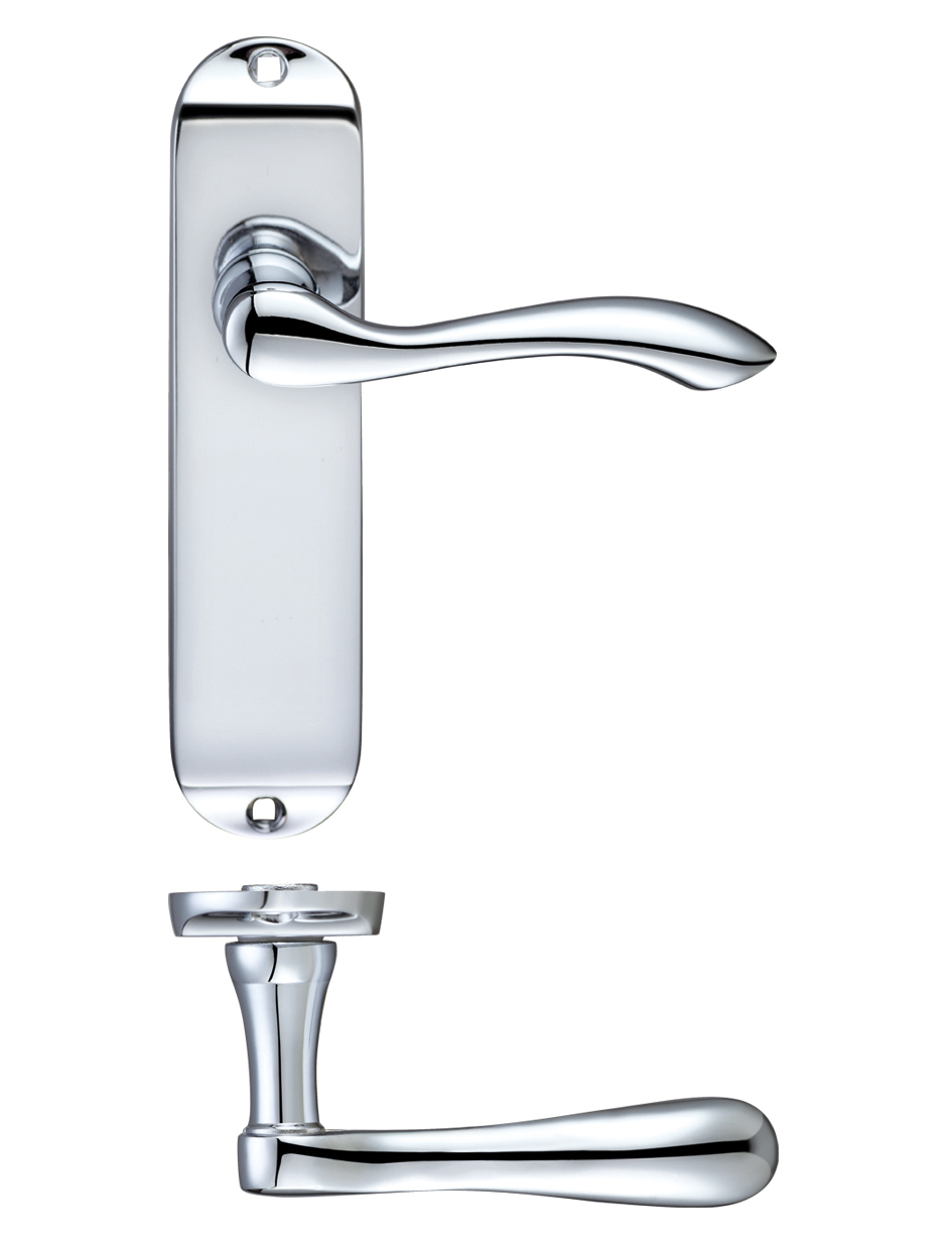 The PR0 RANGE Project Arundel Lever on Latch Backplate includes an elegantly curved lever handle mounted on a substantial rectangular backplate, finished in polished chrome for a bright, reflective appearance. This face-fix design offers a classic and practical solution for internal doors, with the generous 174mm x 42mm backplate providing excellent coverage and a professional finish. The smooth, flowing lines of the Arundel lever design combine contemporary styling with timeless appeal, making it suitable for both traditional and modern interiors.