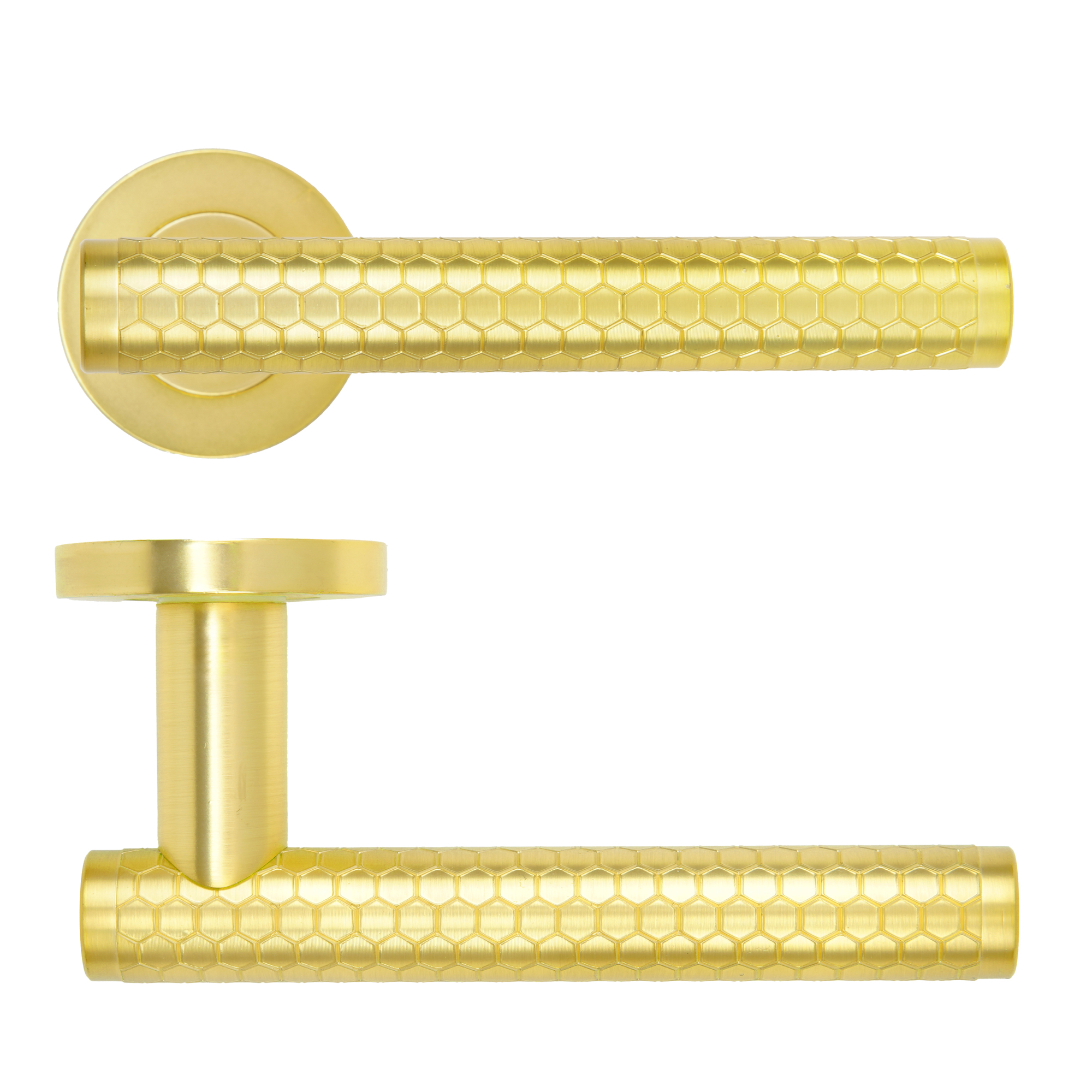 The ROSSO MANIGLIE Favo Lever On Round Rose 50mm x 8mm features a distinctive honeycomb pattern design with full zinc construction for durability and style. This elegant satin brass lever handle set includes 50mm diameter x 8mm deep round sprung roses with 4-point fixing inner roses and screw-on covers for a clean finish. Designed for ease of installation, it comes with both wood screws and bolt-through fixings suitable for 35mm-54mm doors without requiring break-off screws, plus an improved allen key and grub screw on the lever underside for secure fitting. The kit demonstrates environmental consciousness with no plastic packaging, making it an excellent choice for those seeking both contemporary aesthetics and practical functionality in their door hardware.