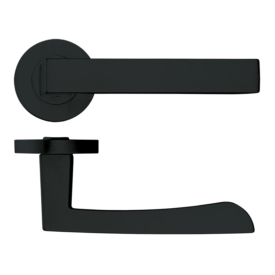 The ROSSO MANIGLIE Mensa Lever On Screw On Rose features a contemporary design with an Oscuro Matt Black finish, creating a sophisticated and modern aesthetic for any interior door. This kit includes a stylish lever handle, a 50mm x 8mm round sprung rose with screw-on mounting for secure installation, a spindle, and all necessary fixings. Suitable for doors ranging from 35-54mm thickness, this versatile handle set combines elegant minimalist styling with practical functionality, making it an ideal choice for residential and commercial applications seeking a premium matt black finish.