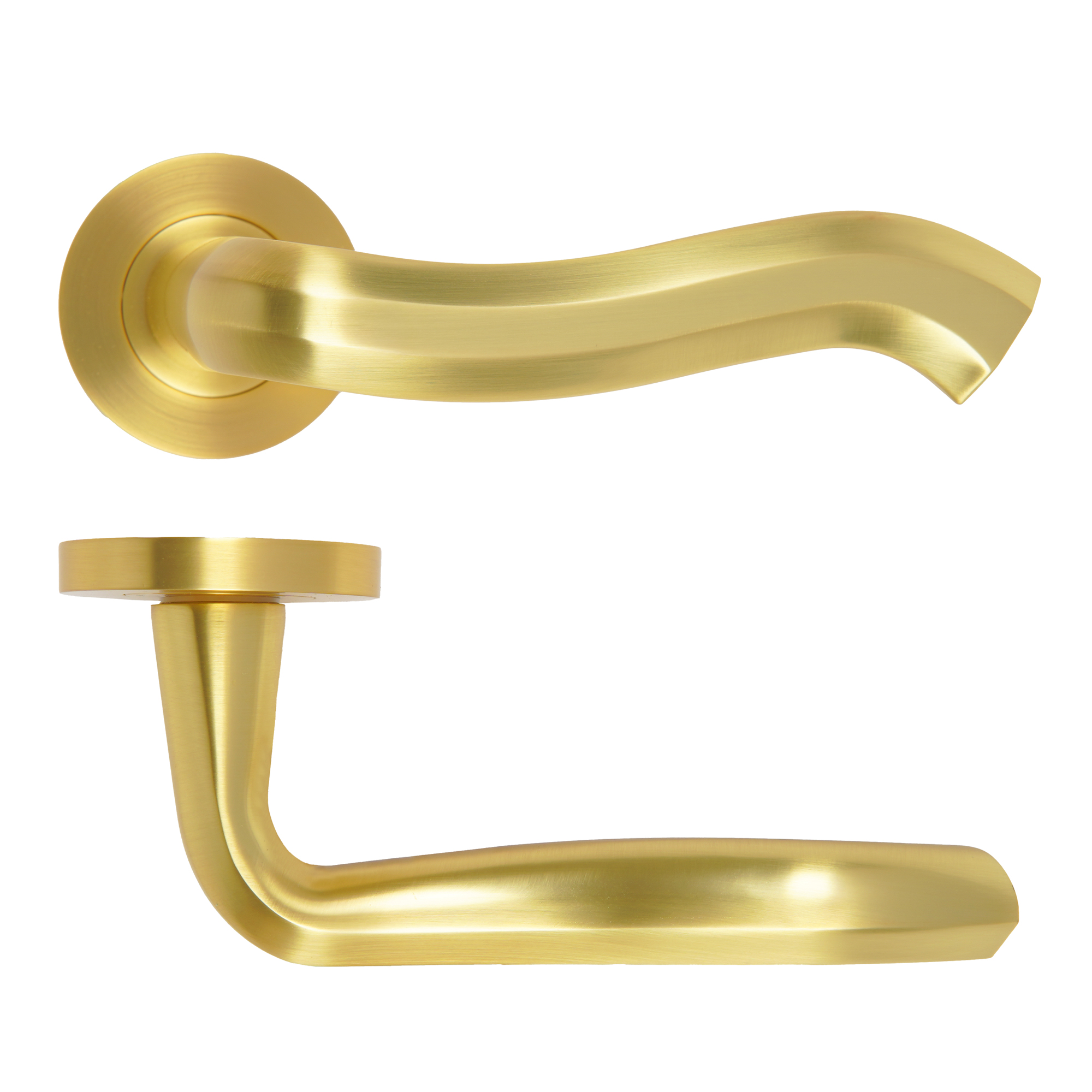 The ROSSO MANIGLIE Rococo Lever On Round Rose 50mm x 8mm in Satin Brass includes an elegantly curved lever handle mounted on a 50mm diameter round rose with an 8mm depth. This contemporary design features full zinc construction with a luxurious satin brass finish, providing both durability and aesthetic appeal. The kit includes a 4-point fixing inner rose with screw-on cover, wood screws, and bolt through fixings, making it suitable for doors ranging from 35mm to 54mm thickness without requiring break-off screws. The improved allen key design ensures easier installation, while the grub screw on the underside of the lever provides secure attachment. Environmentally conscious packaging excludes plastic materials, making this an excellent choice for modern interior door applications.