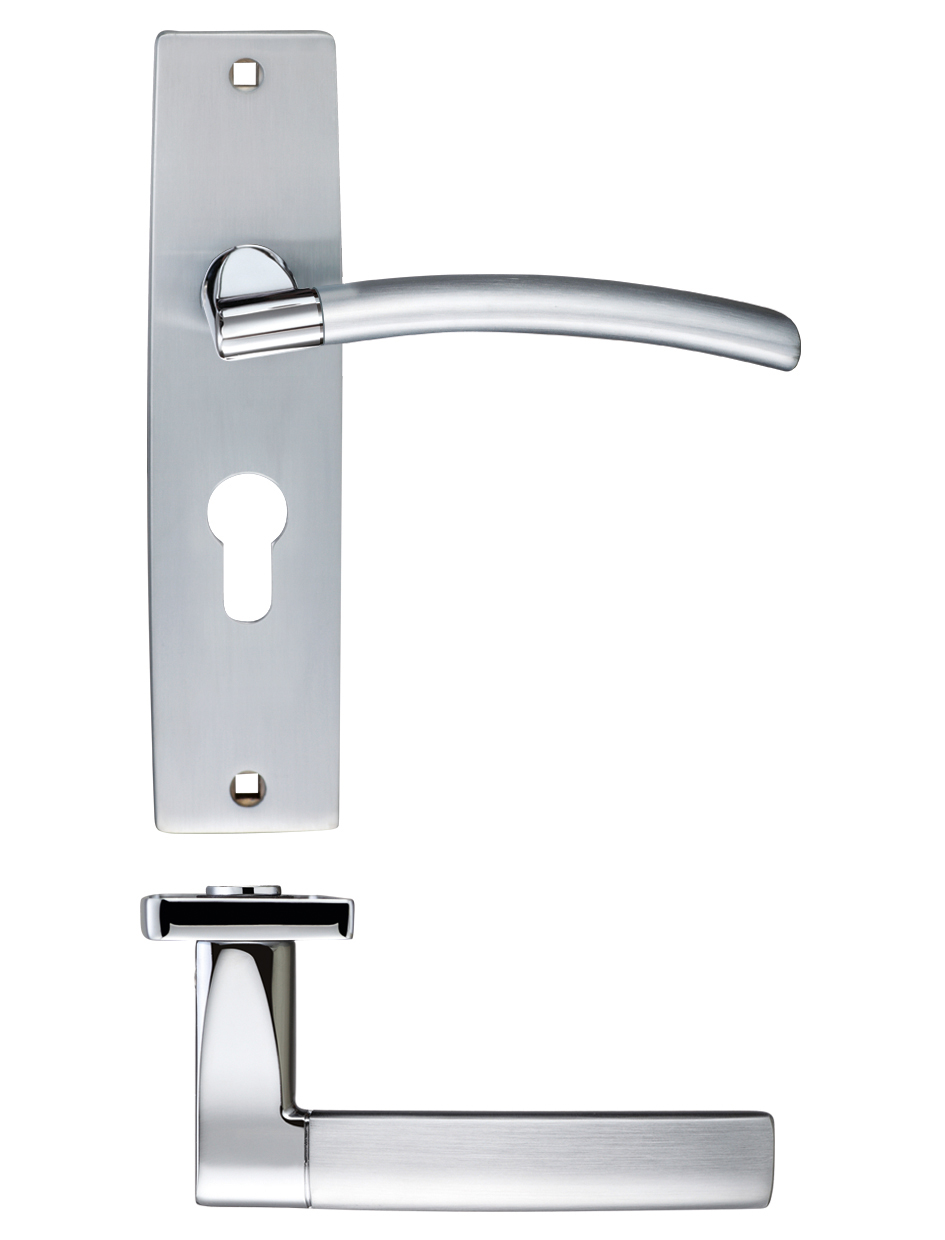 The STANZA Amalfi Lever Euro Lock on Backplate features an elegant dual-finish design combining satin chrome and polished chrome for a contemporary aesthetic. This premium door handle set includes a curved lever handle, euro profile backplate with 47.5mm center-to-center fixing, secure bolt-through fixings, and spindle. Certified to BS EN 1634-1 standards, this handle offers both style and reliability, making it ideal for modern residential and commercial applications where a sophisticated dual-tone metallic finish is desired.