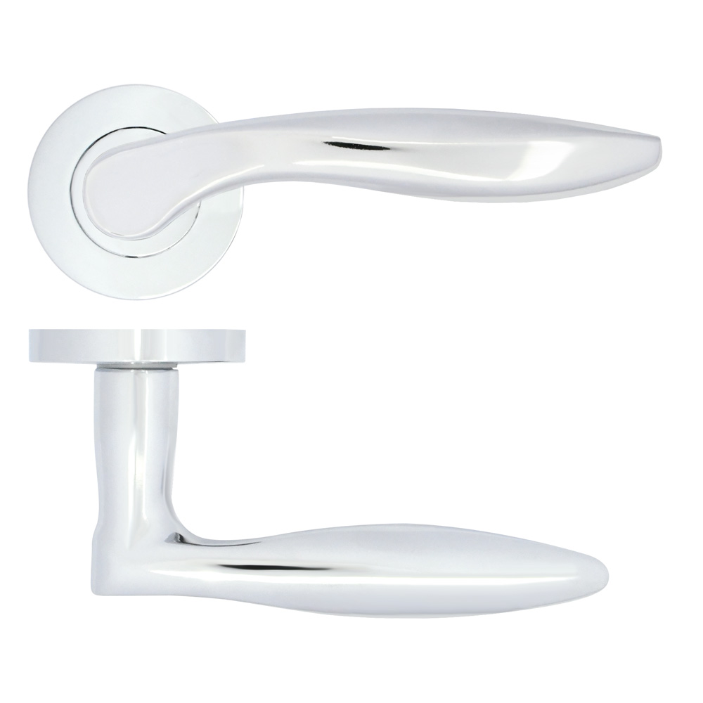 The STANZA Cadiz Lever on Rose Polished Chrome features a contemporary aluminium lever mounted on a robust zinc rose, offering both style and durability. The 50mm diameter round sprung rose with screw-on cover provides a clean, professional finish suitable for doors between 35-54mm thick. Supplied with both bolt-through and wood screw fixing options for versatile installation, this handle includes a grub screw on the underside of the lever for secure fitting. The polished chrome finish delivers a bright, reflective surface that complements modern interiors, while the eco-conscious design eliminates plastic packaging.