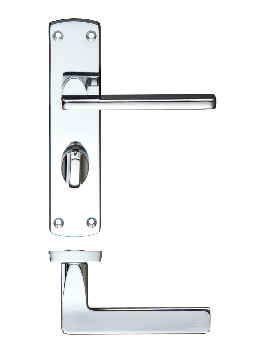 The STANZA Leon Lever Bathroom door handle on backplate features a sleek contemporary design with a polished chrome finish that adds a modern, professional aesthetic to any bathroom door. This face-fix handle includes a 170mm x 40mm backplate with a 57mm centre cylinder hole, providing secure bathroom privacy functionality. The kit comes complete with all necessary fixings for straightforward installation and is certified to BS EN 1634-1 standards, ensuring reliable performance and quality. The smooth lever action combined with the durable polished chrome finish makes this an excellent choice for both residential and commercial bathroom applications.