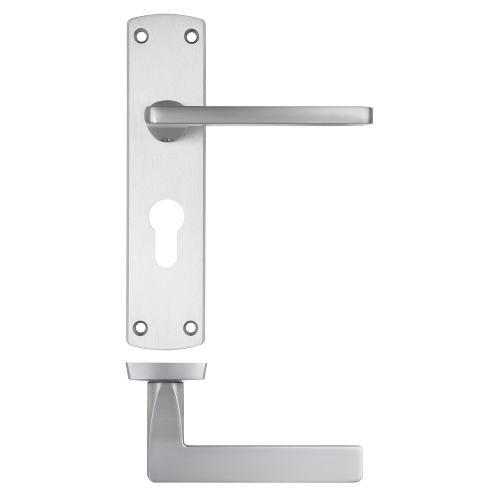 The STANZA Leon Lever on Euro Backplate features full aluminium construction throughout, offering durability and a premium feel. This contemporary handle set includes a sleek lever handle with matching 40mm x 170mm euro backplate (47.5mm c/c) and spindle, all finished in an attractive satin chrome. The aluminium construction ensures long-lasting performance while maintaining a lightweight profile. Environmentally conscious packaging with no plastic materials demonstrates Stanza’s commitment to sustainability. Ideal for modern interior doors requiring euro cylinder locks, this handle combines style, quality and practicality.