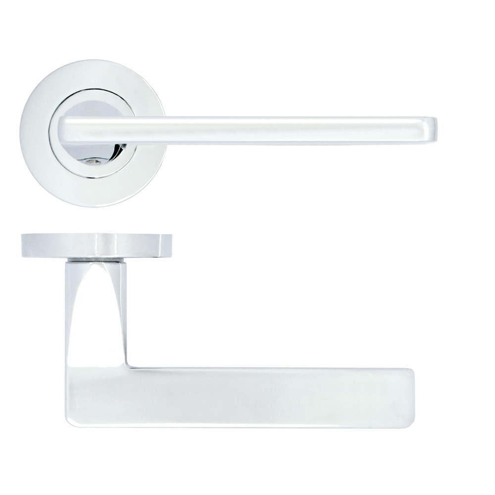 The STANZA Leon Lever on Rose Polished Chrome features a contemporary design with a sleek aluminium lever mounted on a robust zinc rose. This modern door handle combines style with functionality, offering a 50mm x 8mm round sprung rose with a convenient screw-on cover for easy installation. The handle is supplied with both bolt-through and wood screw fixings, making it suitable for doors ranging from 35-54mm thickness. The lever features a grub screw on the underside for secure fitting, and the product demonstrates environmental responsibility by eliminating plastic packaging. Its polished chrome finish provides a bright, reflective surface that complements modern interior design schemes.