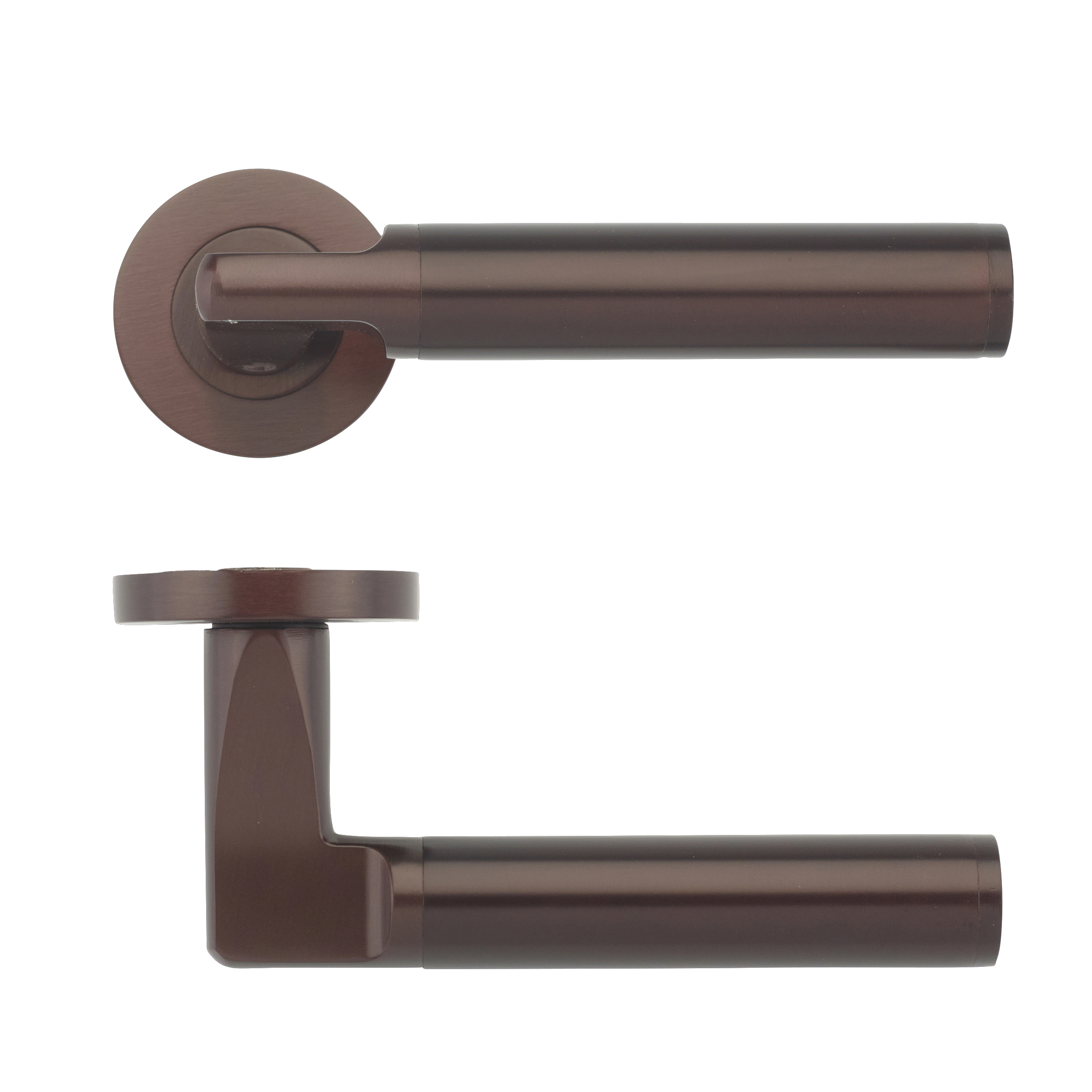 The STANZA Milan Lever on Screw On Rose in Etna Bronze includes a contemporary cylindrical lever handle with matching 50mm x 8mm round sprung rose, bolt-through fixings, and spindle. This stylish door handle features a rich Etna Bronze finish with a subtle brushed texture, providing both visual appeal and durability. The screw-on rose design ensures secure installation, while the bolt-through fixings offer enhanced strength and stability. Suitable for doors ranging from 35-54mm thickness, this handle combines modern aesthetics with practical functionality. Tested to BS EN 1634-1 standards, it delivers reliable performance for residential and commercial applications.