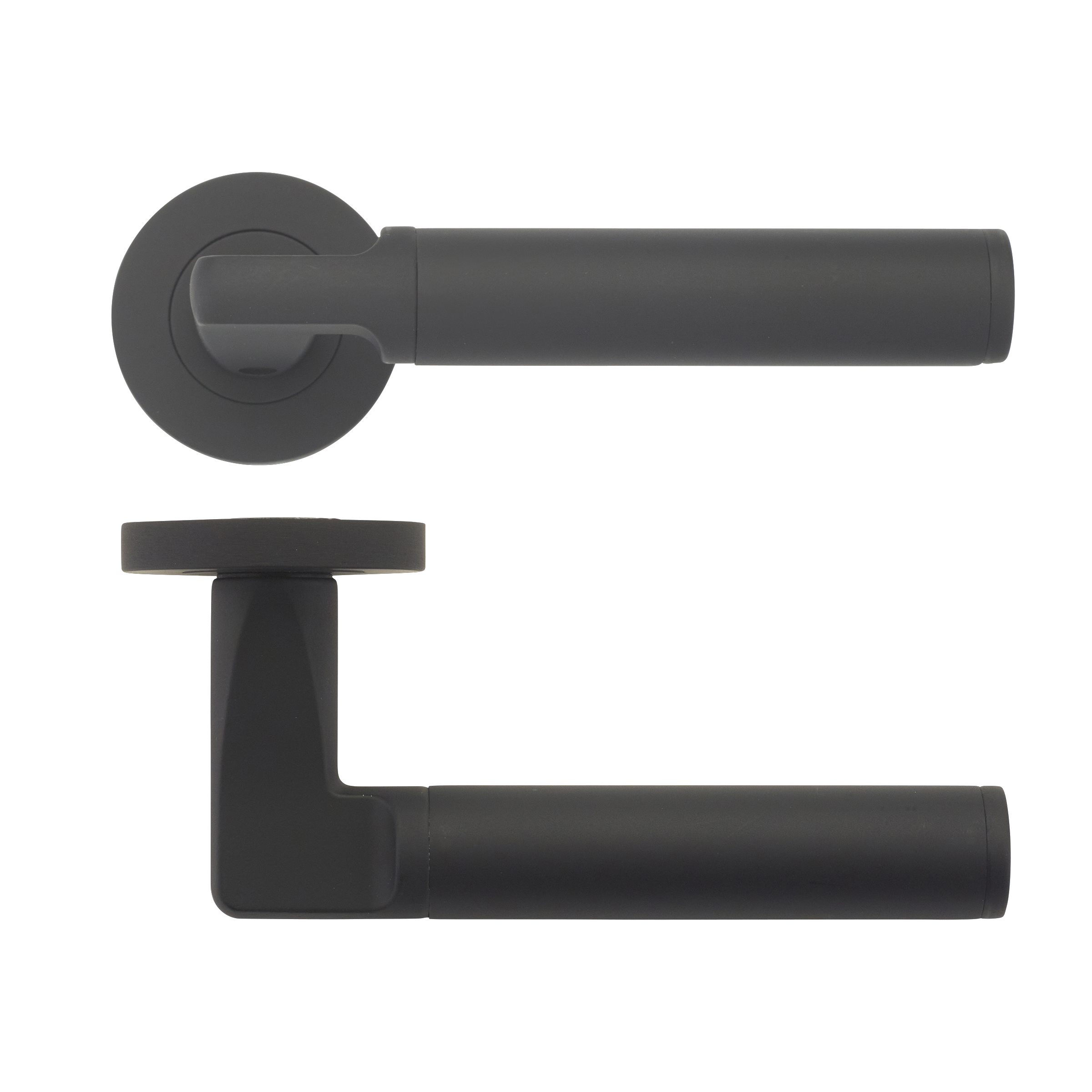 The STANZA Milan Lever on Screw on Rose in Oscuro Matt Black includes a contemporary cylindrical lever handle with matching 50mm x 8mm round sprung rose, spindle, and bolt-through fixings. This stylish door handle features a sophisticated matt black finish that adds a modern, elegant touch to any interior door. Certified to BS EN 1634-1 fire safety standards and suitable for doors ranging from 35-54mm thickness, this handle combines aesthetic appeal with practical functionality and reliable performance.
