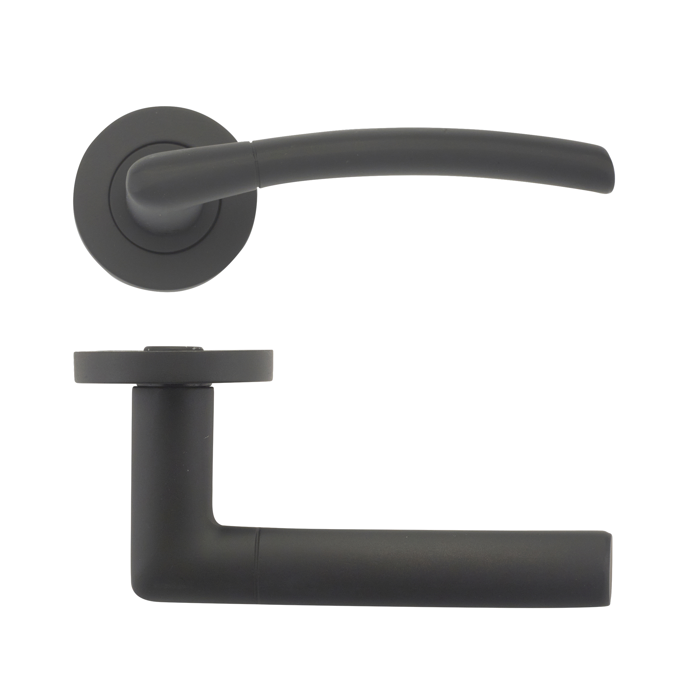 The STANZA Olympus lever on round rose in Oscuro Matt Black includes a contemporary curved lever handle mounted on a 50mm x 8mm round sprung rose with screw-on design. This kit features bolt-through fixings for secure installation and is suitable for doors ranging from 35-54mm thickness. The handle is certified to BS EN 1634-1 standards, ensuring reliable performance and quality construction. The modern matt black finish provides a sophisticated aesthetic that complements contemporary interior designs while offering excellent durability and fingerprint resistance.