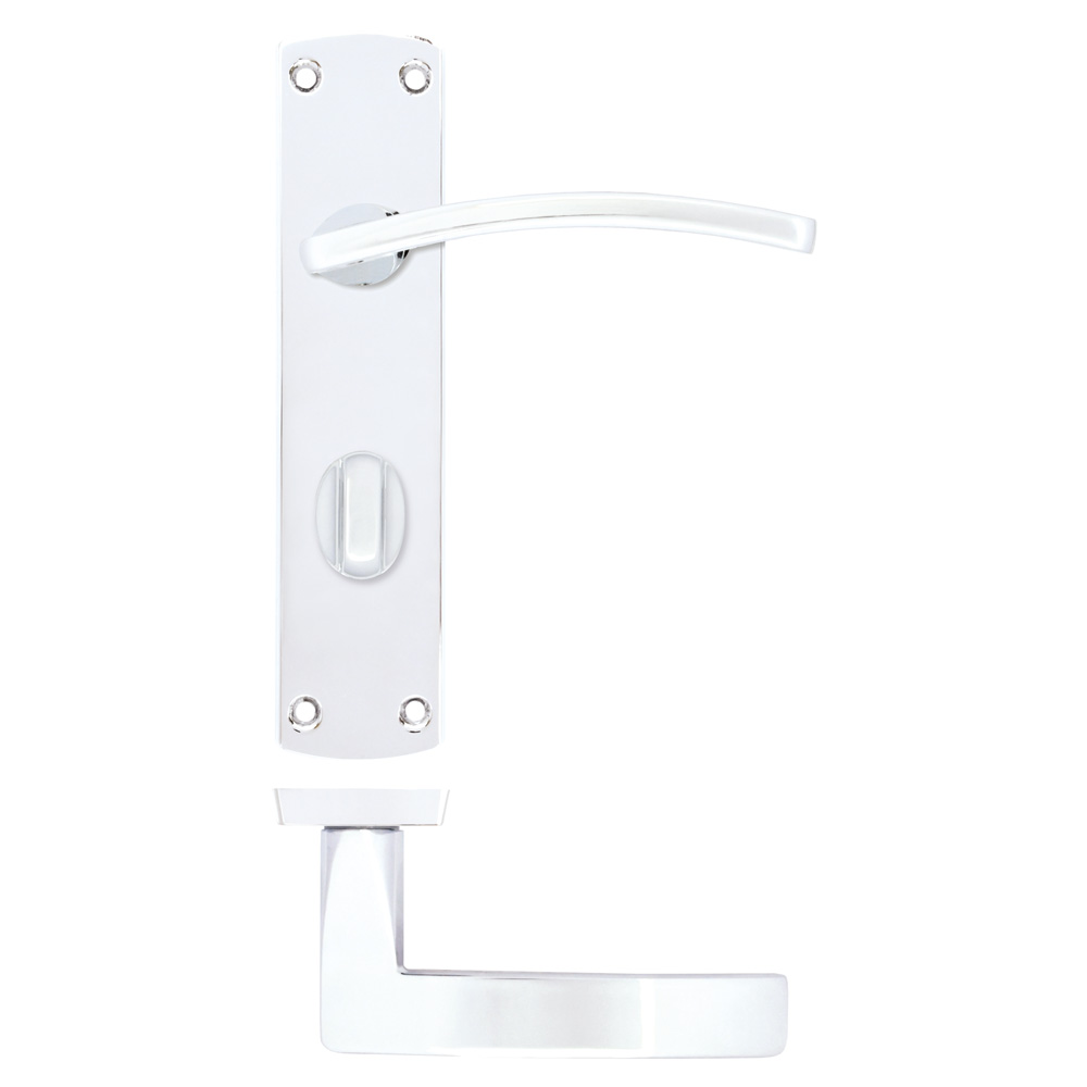 The STANZA Toledo Lever on Bathroom Backplate in Polished Chrome includes a contemporary curved lever handle mounted on a sleek rectangular backplate with integrated privacy keyhole. Constructed entirely from aluminium for durability and corrosion resistance, this bathroom door handle set features a 40mm x 170mm backplate with 57mm centre-to-centre fixing for bathroom locks. The polished chrome finish provides a bright, reflective surface that complements modern bathroom décor while being easy to clean and maintain. Supplied complete with fixing screws and spindle, this eco-conscious product arrives without plastic packaging.