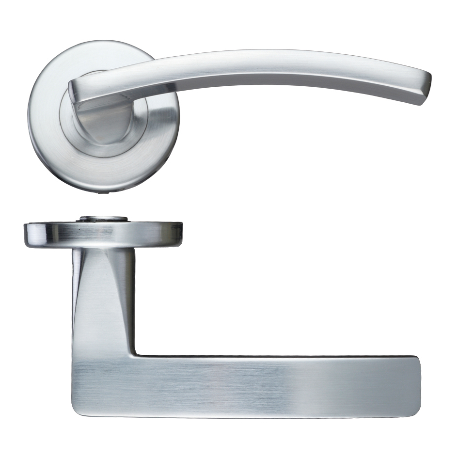The STANZA Toledo Lever on Push-On Rose in Satin Chrome features a contemporary curved lever design with a sleek brushed finish. This 52mm x 8mm round sprung rose handle is tested to BS EN 1634-1 standards and includes bolt-through fixings for secure installation. Suitable for doors ranging from 35-54mm thickness, the push-on rose design allows for quick and easy fitting, making it ideal for both residential and commercial applications where a modern, durable door handle solution is required.