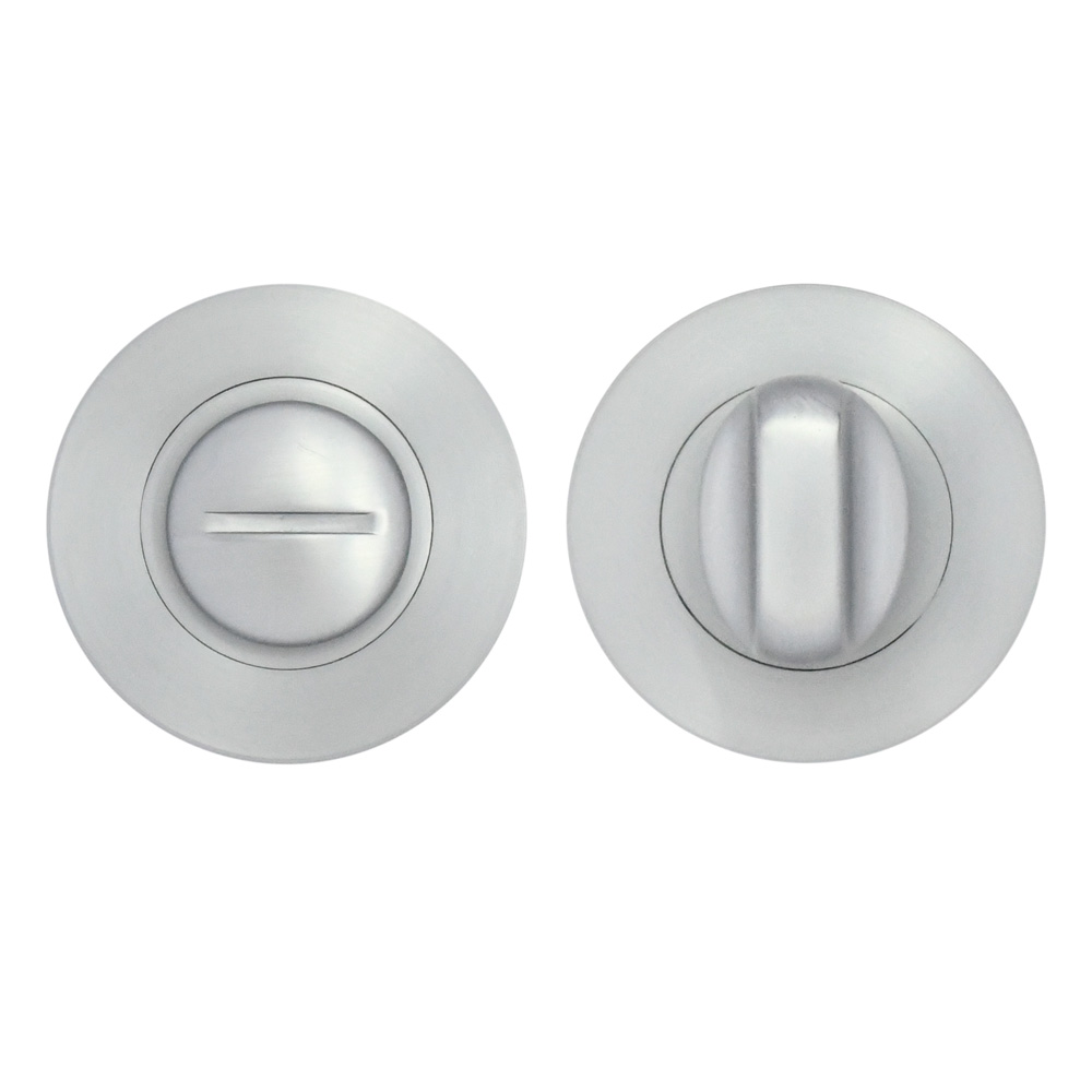 The STANZA Turn & Release on Round Rose Satin Chrome provides a sleek and functional privacy lock solution for interior doors. Featuring a robust zinc sub-base construction with an aluminium finish, this 50mm diameter round rose with 8mm depth offers both durability and contemporary styling. The satin chrome finish delivers a sophisticated brushed metallic appearance that complements modern interiors. Supplied with fixing screws and manufactured without plastic packaging, this thumbturn combines practical functionality with environmental consideration, making it an ideal choice for bathroom and bedroom door applications.