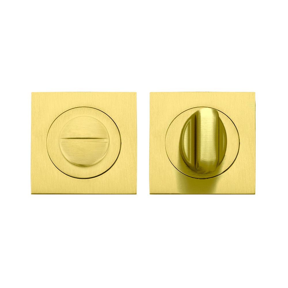 The STANZA Turn & Release on Square Rose in Favo Satin Brass includes a contemporary 50mm x 8mm square zinc rose with integrated turn and release mechanism, complete with 5mm spindle, grub screw rose fixing, and all necessary fixing screws. This elegant satin brass finished thumbturn provides smooth operation for bathroom and bedroom privacy locks, and is designed to coordinate perfectly with customised ZPZ square lever on rose handles for a cohesive aesthetic throughout your property.