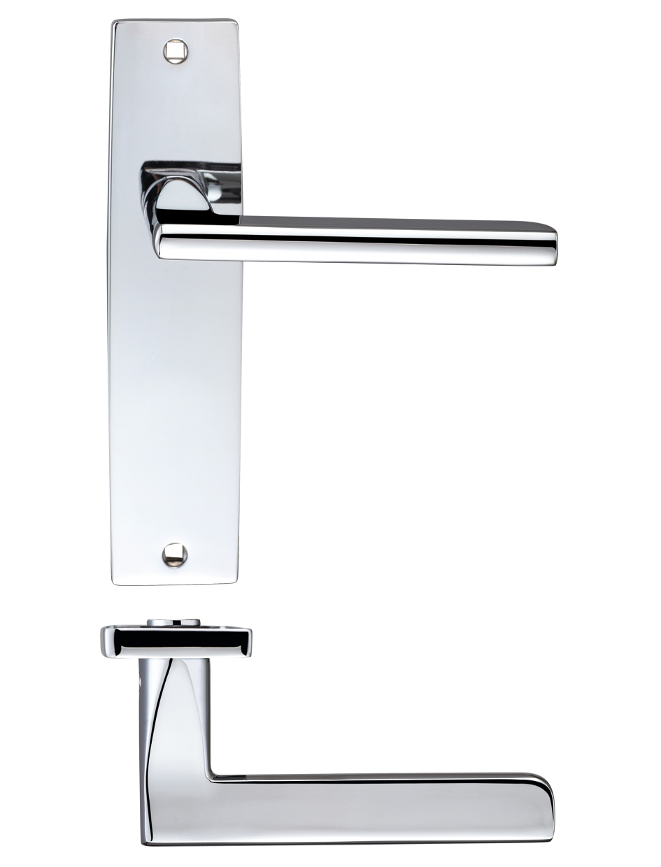 The STANZA Venice Lever Latch On Backplate features a contemporary polished chrome finish with clean, angular lines that complement modern interior design. This handle set includes a sleek lever handle, rectangular backplate (180x43mm), secure bolt-through fixings, and spindle mechanism. Certified to BS EN 1634-1 standards, this professional-grade door furniture combines striking aesthetics with reliable performance, making it an excellent choice for both residential and commercial applications where a sophisticated, minimalist look is desired.