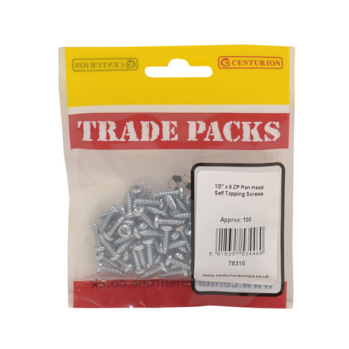 The Tradepack Pan Head Self Tapping Screws include 100 zinc-plated fasteners designed for superior performance in sheet material applications. These versatile 1/2″ x 6 screws feature a pan head design that sits flush against the surface, providing a clean finish. The zinc plating offers excellent corrosion resistance, making them ideal for various applications in engineering, DIY, ironmongery, electrical, and plumbing work.