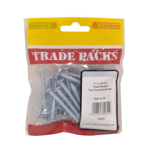 The Tradepack Pozi Twinthread Countersunk Woodscrews are versatile zinc-plated fasteners ideal for a range of applications including softwoods, hardwoods, chipboards and fibreboards. These 2-inch screws feature a specialized twin thread design for easy starting and driving, while the countersunk head ensures a flush, professional finish. The zinc plating provides excellent corrosion resistance, making them suitable for general construction and woodworking projects.