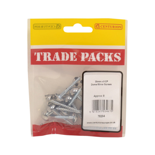 The TRADEPACK Chrome Plated Dome Mirror Screws include 8 high-quality 35mm screws with matching decorative dome covers. These specialized screws are designed for securely mounting pre-drilled mirrors to suitable surfaces while providing an elegant, professional finish. The chrome plated dome covers neatly conceal the screw heads, creating a clean and sophisticated appearance.
