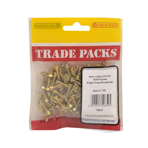 The TRADEPACK Pozi Multi Purpose Countersunk Woodscrews feature a zinc yellow passivated finish for enhanced durability and corrosion resistance. These versatile 4mm x 15mm screws are designed for multiple applications including softwoods, hardwoods, chipboard, and MDF. The single thread design provides superior holding power, particularly in particle boards, while the countersunk head ensures a flush, professional finish.
