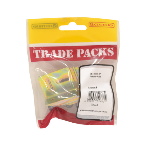 The TRADEPACK Stretcher Plate pack includes 8 versatile zinc-plated steel brackets designed for multiple applications in carpentry and joinery. These durable 38mm x 28mm plates are ideal for securing worktops, shelves, and other woodworking projects. The zinc plating provides excellent corrosion resistance, making them suitable for both indoor and outdoor use. Their robust construction and practical size make them a reliable choice for professional trade and DIY applications.