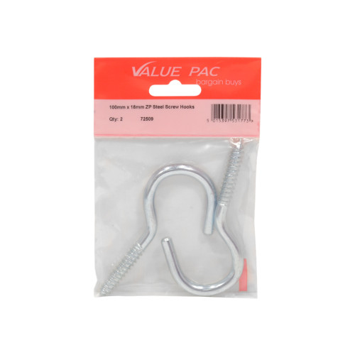 The Value Pack 100mm x 18mm ZP Steel Screw Hooks are robust zinc-plated steel hanging solutions ideal for various household applications. Each pack includes 2 heavy-duty screw hooks featuring a 100mm length and 18mm diameter, perfect for secure hanging of items in garages, sheds, or around the home. Part of the Value Pac range offering essential home hardware at affordable prices.