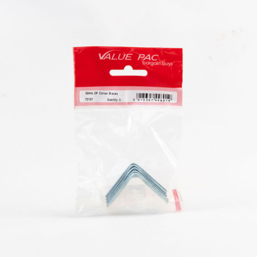 The Value Pack 38mm ZP Corner Brace pack includes 5 zinc-plated corner braces designed for general household joinery and furniture assembly. These sturdy metal brackets provide reliable corner reinforcement and support for various DIY projects and home repairs. Part of the Value Pac range offering essential home hardware at affordable prices.